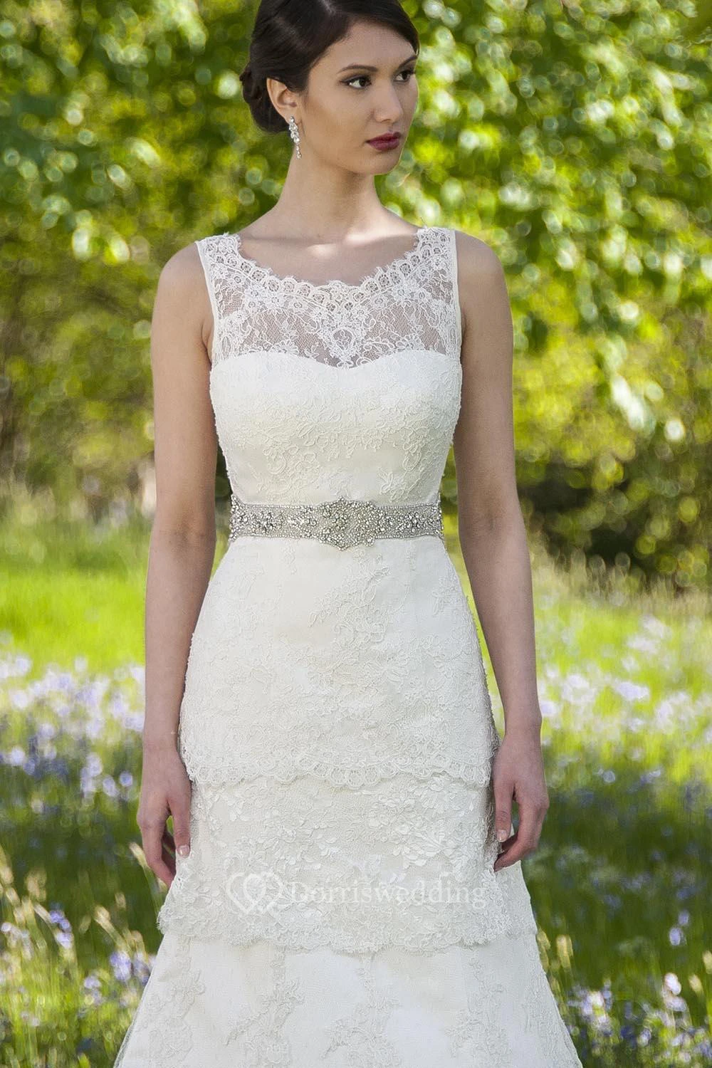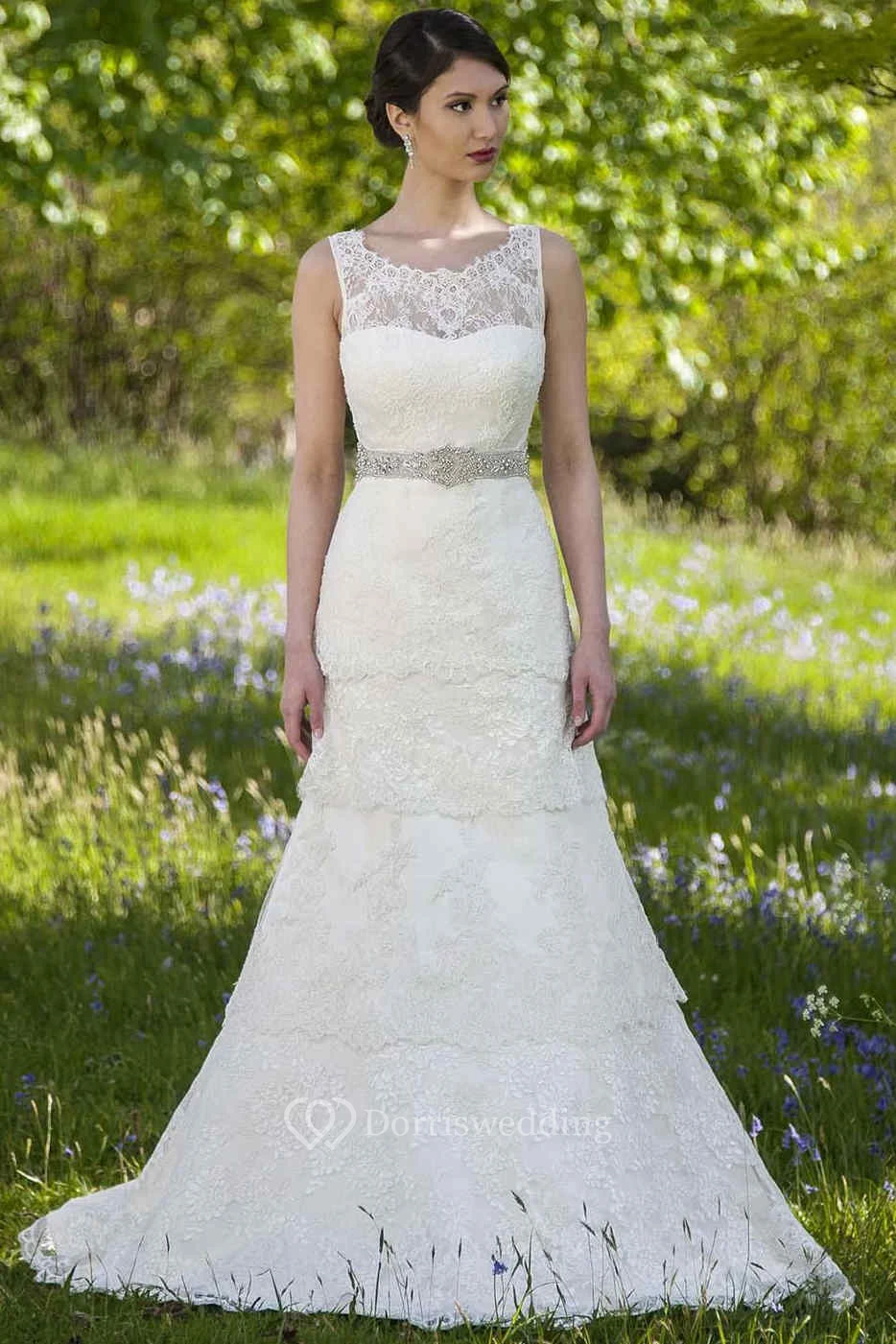 A-Line Jeweled Scoop-Neck Floor-Length Sleeveless Lace Wedding Dress With Appliques And Tiers