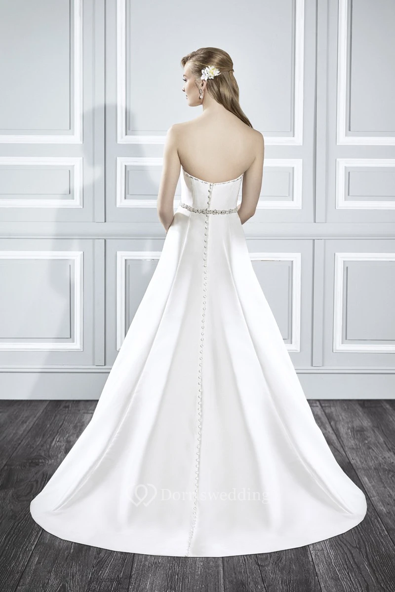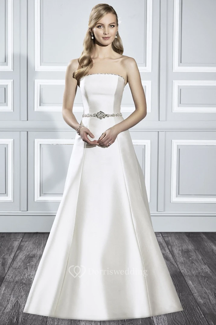 A-Line Jeweled Sleeveless Floor-Length Strapless Satin Wedding Dress With Sweep Train And Backless Style