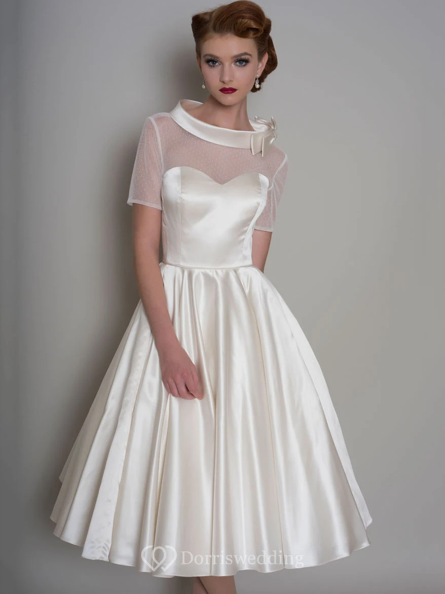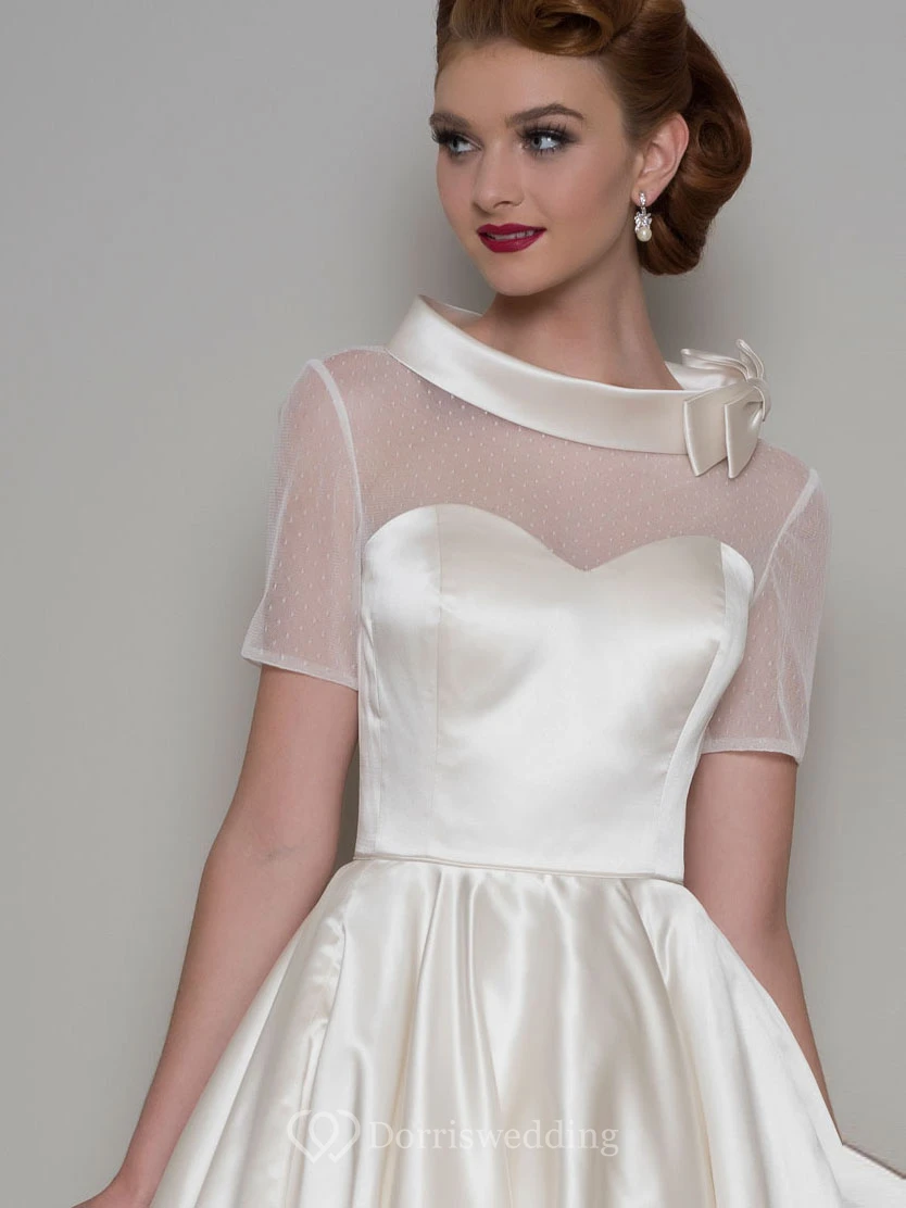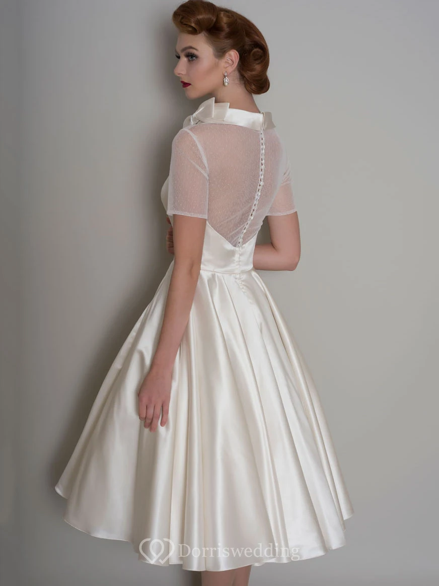A-Line Knee-Length Bowed Short-Sleeve Satin Wedding Dress