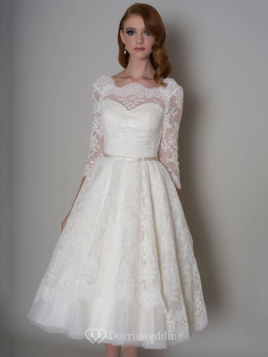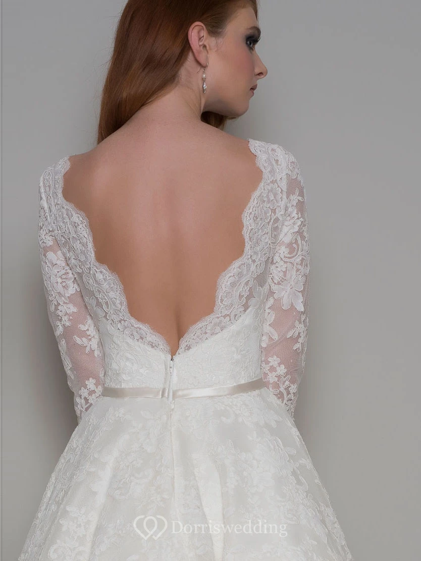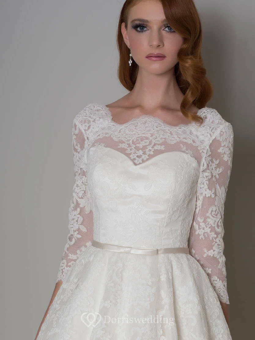 A-Line Knee-Length Half-Sleeve Appliqued Bateau-Neck Lace Wedding Dress
