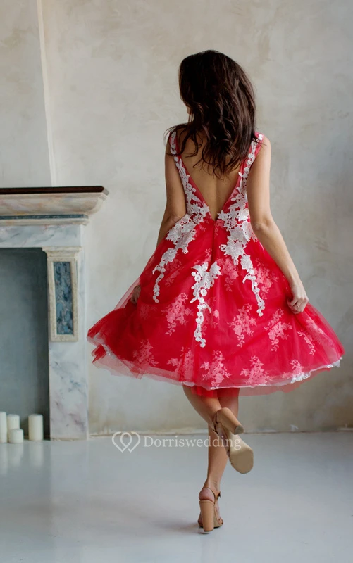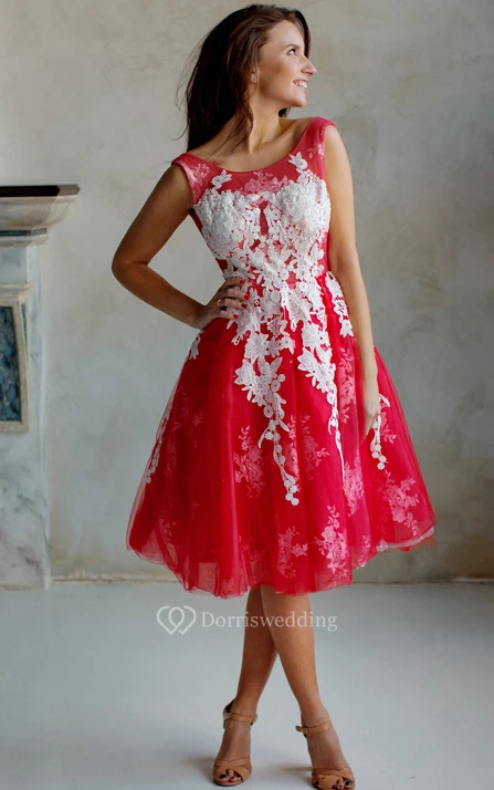 A-Line Knee-Length Jewel Short Sleeve Lace Pleats Low-V Back Dress