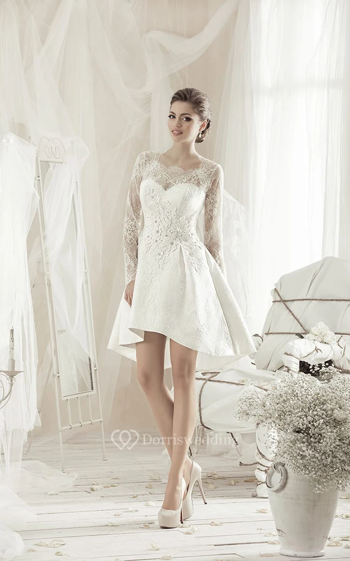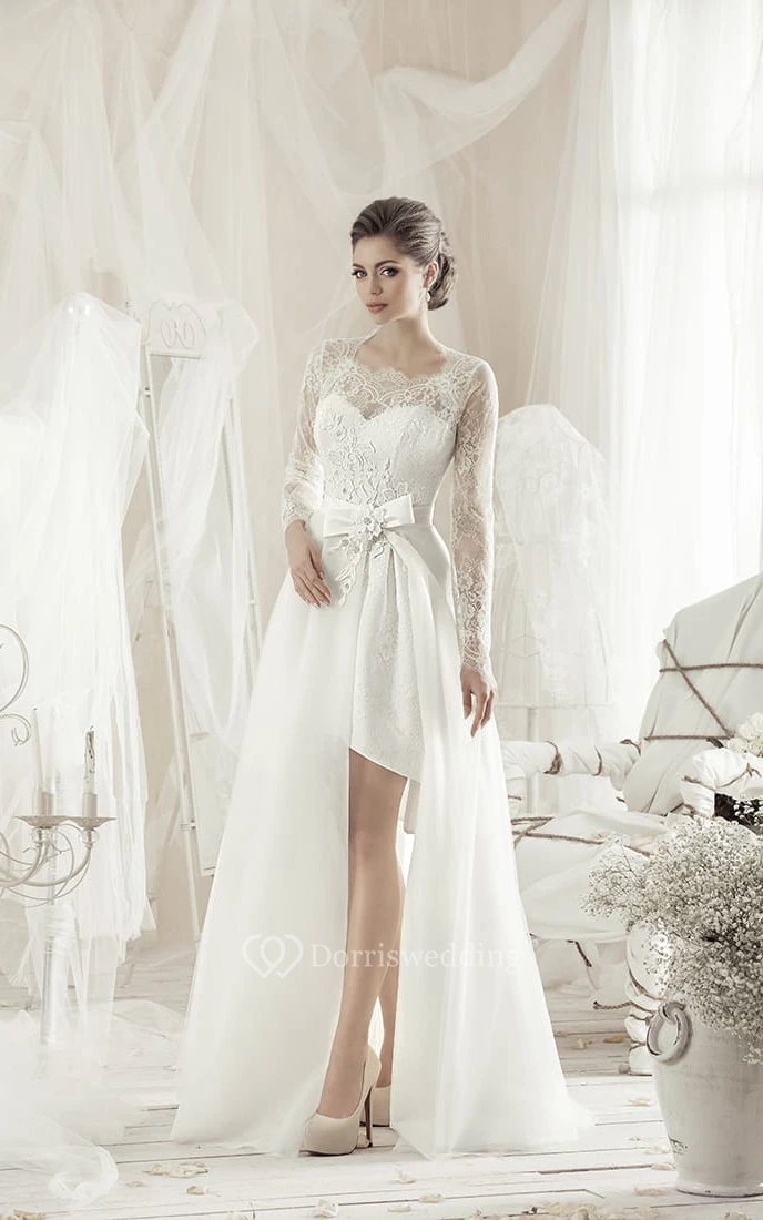 A-Line Knee-Length Square Long-Sleeve Lace Dress With Bow And Appliques