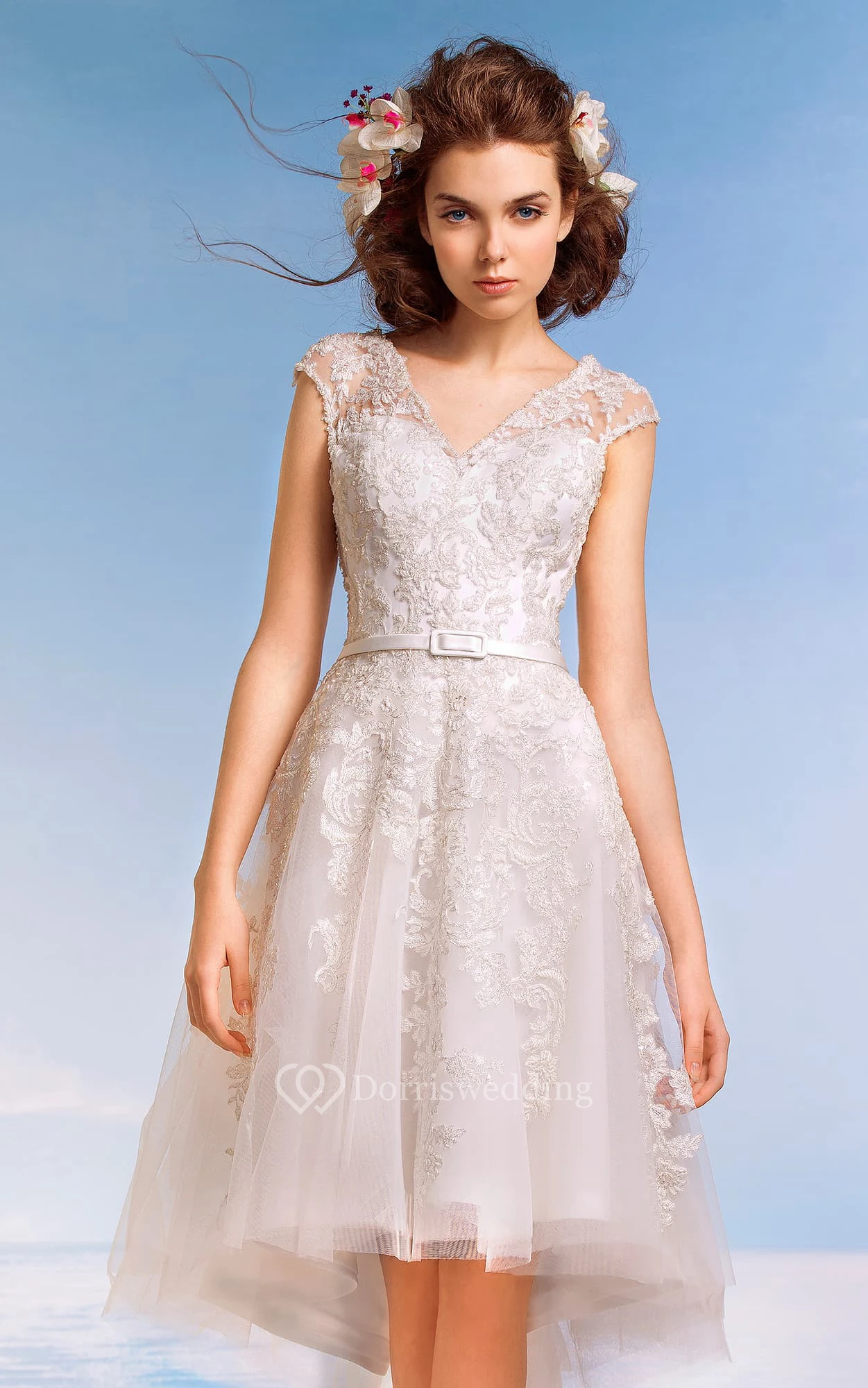 A-Line Knee-Length V-Neck Cap-Sleeve Illusion Lace Dress With Appliques And Pleats