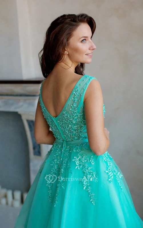 A-Line Knee-Length V-Neck Short Sleeve Tulle Lace Appliques Low-V Back Dress