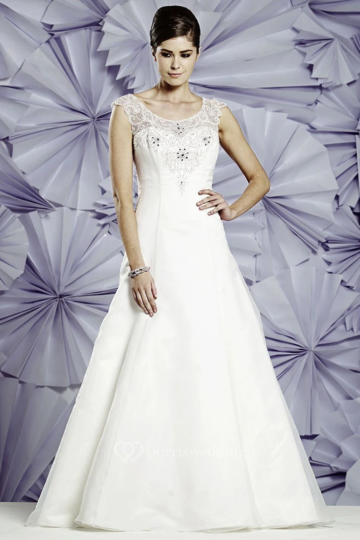 A-Line Lace Long Sleeveless Scoop-Neck Tulle&Satin Wedding Dress With Beading