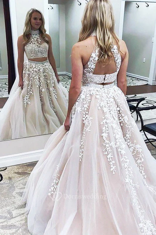 A-Line Lace Tulle High Neck Sleeveless Keyhole Dress