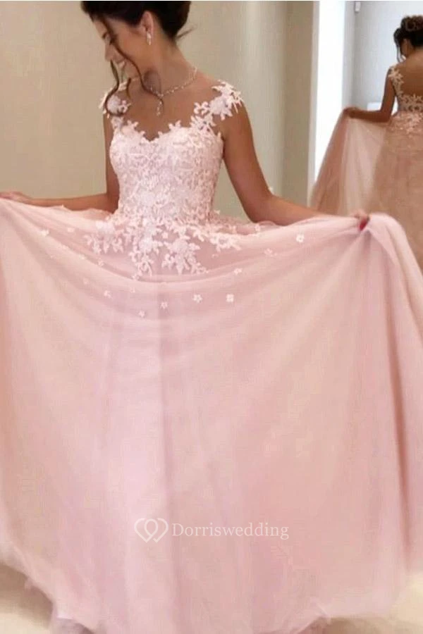 A-Line Lace Tulle Straps V-neck Short Sleeve Zipper Illusion Dress