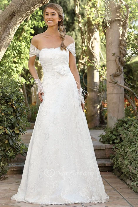 A-Line Long Appliqued Off-The-Shoulder Lace Wedding Dress With Flower