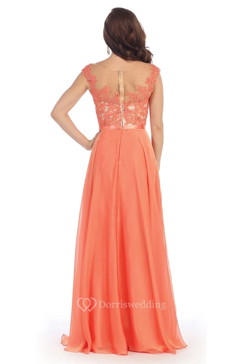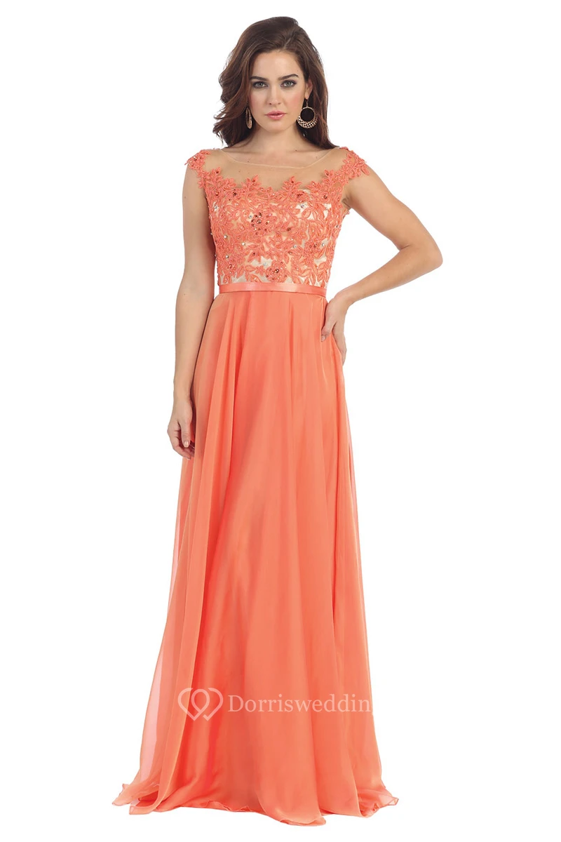A-Line Long Bateau Cap-Sleeve Chiffon Illusion Dress With Appliques And Pleats