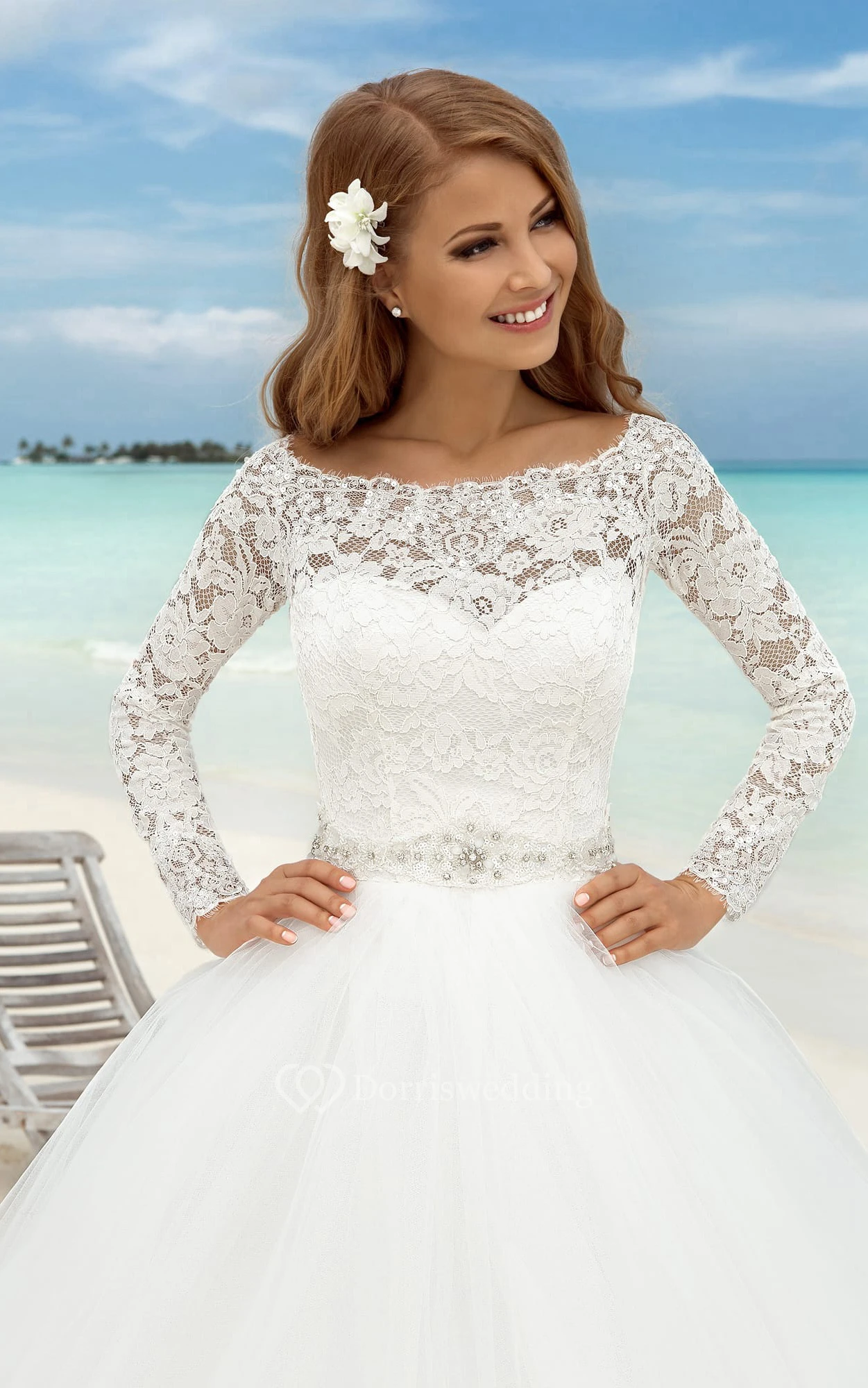 A-Line Long Bateau-Neck Illusion-Sleeve Illusion Tulle Dress With Bow And Sash