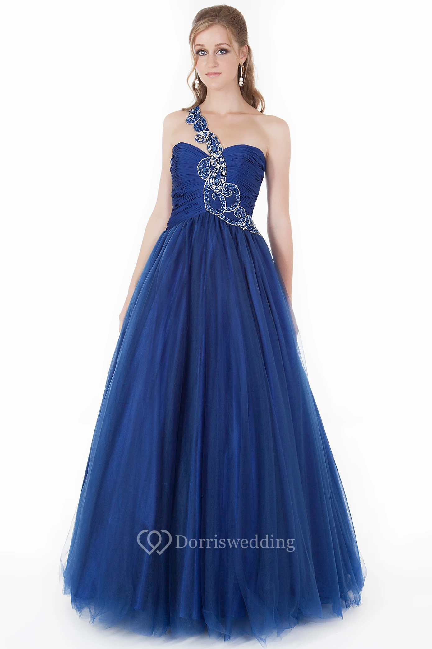 A-Line Long Beaded One-Shoulder Sleeveless Tulle Prom Dress With Pleats