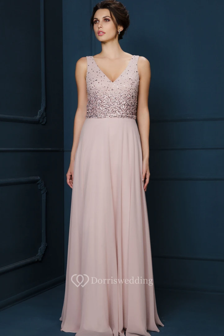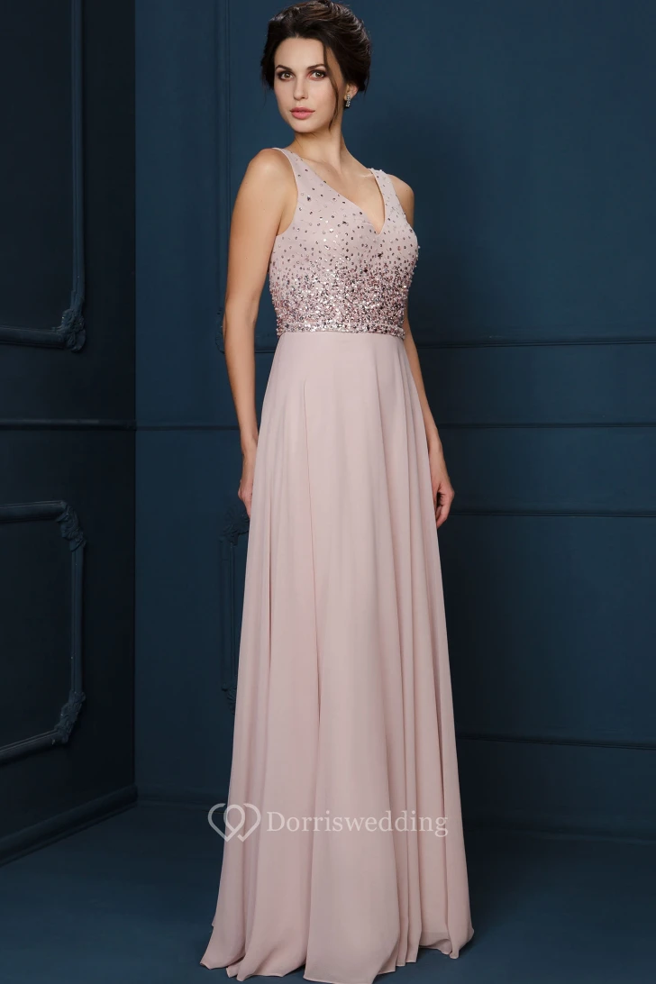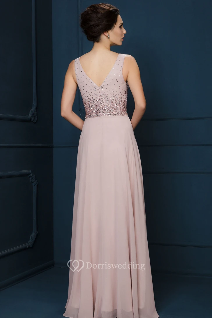 A-Line Long Beaded V-Neck Sleeveless Chiffon Evening Dress