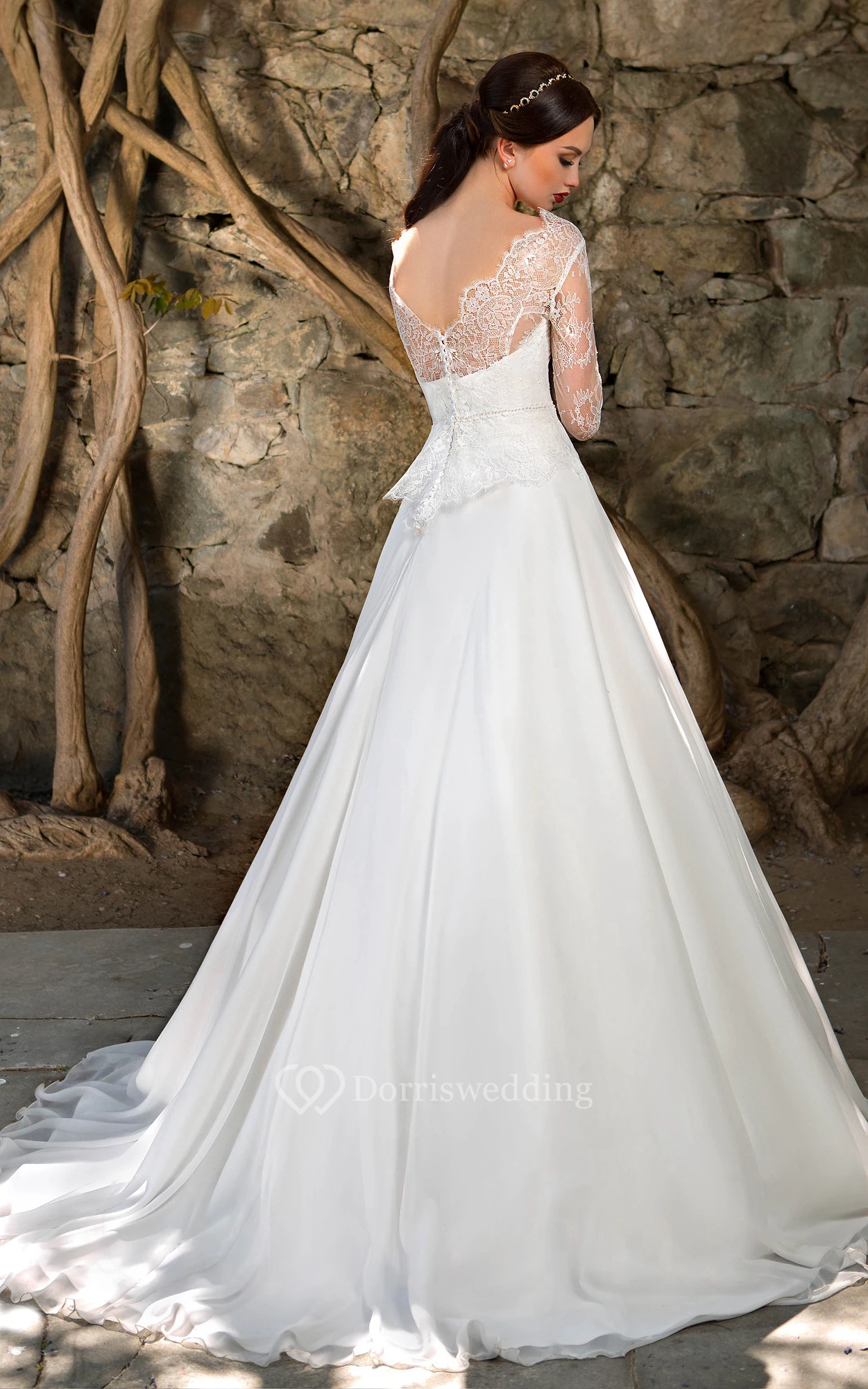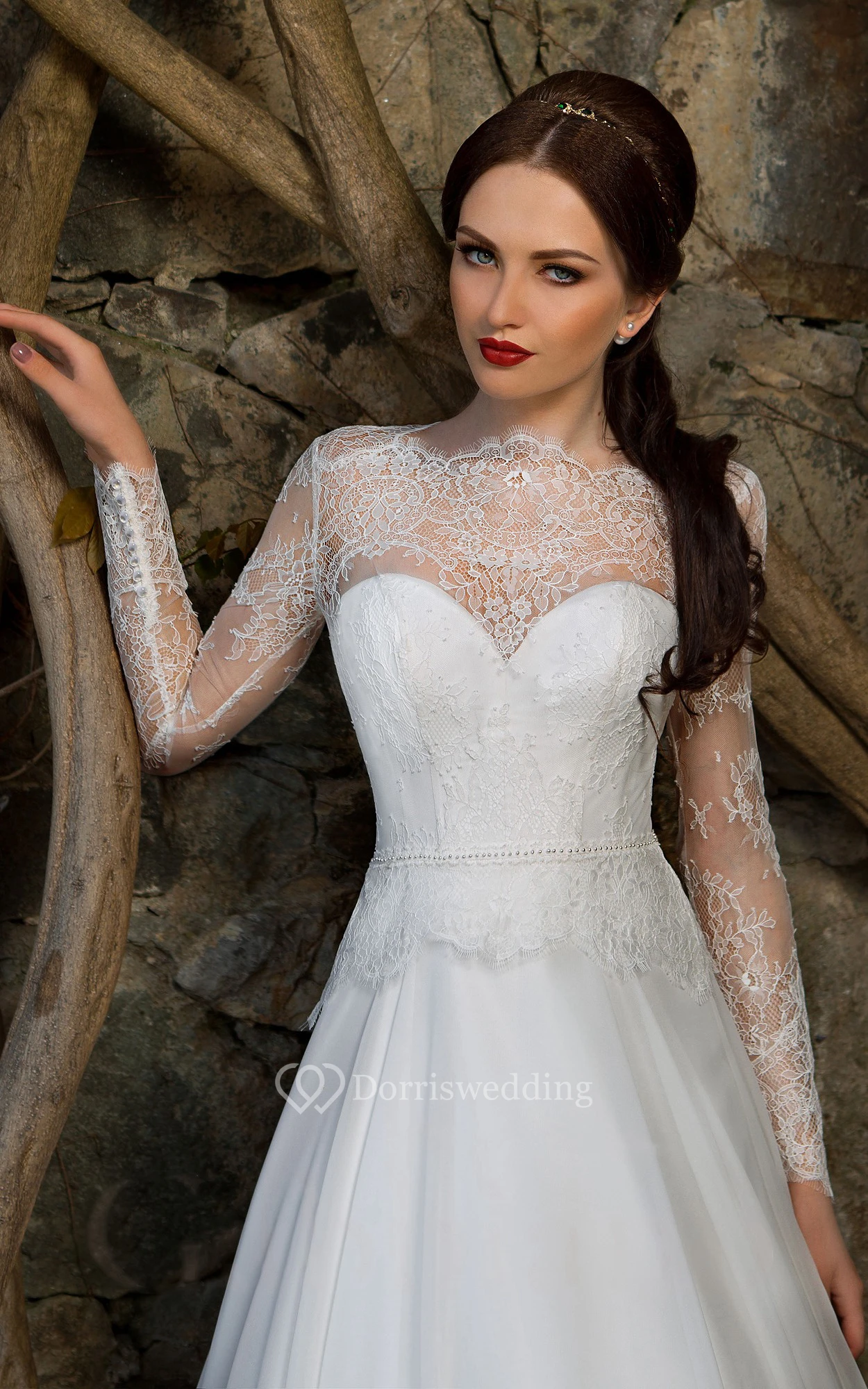 A-Line Long High-Neck Illusion-Sleeve Zipper Chiffon Dress With Lace Appliques And Pleatings