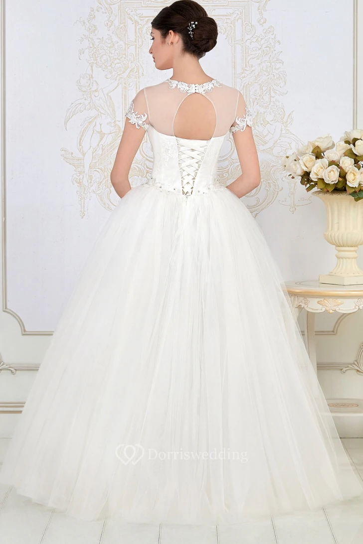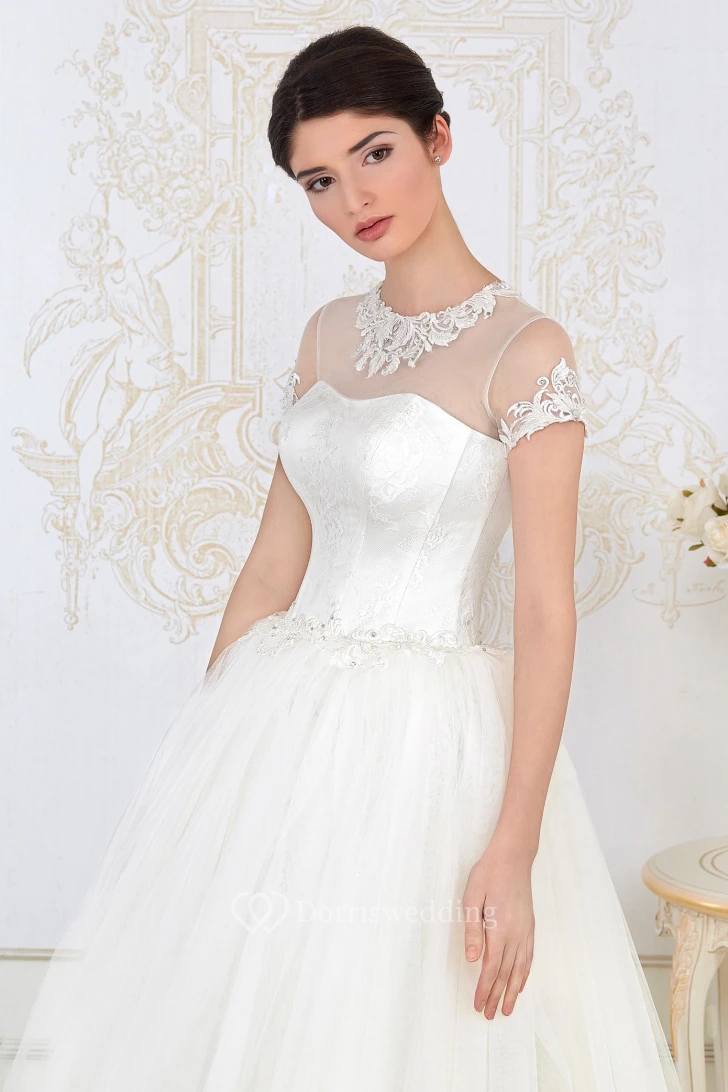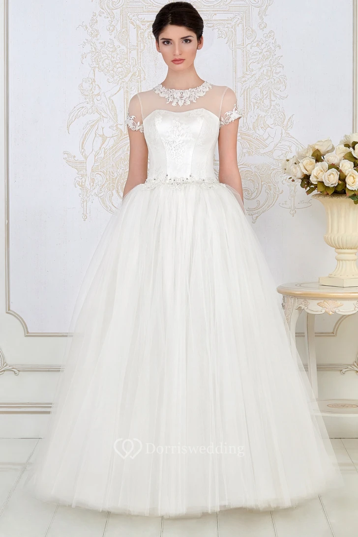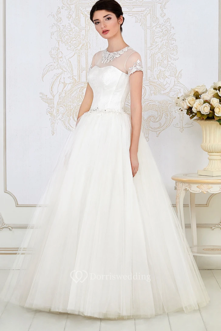 A-Line Long High-Neck Short-Sleeve Embroidered Tulle Wedding Dress With Pleats