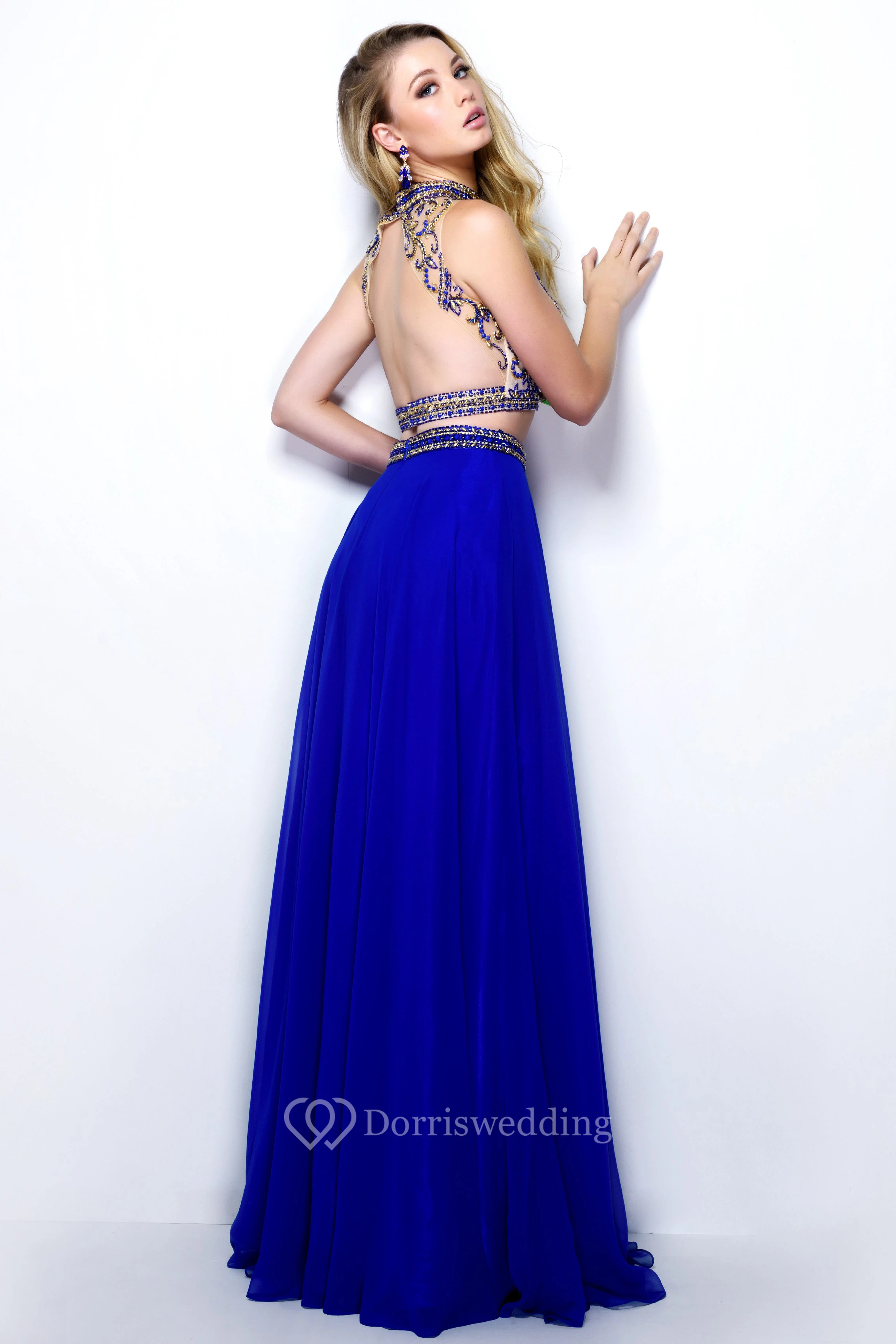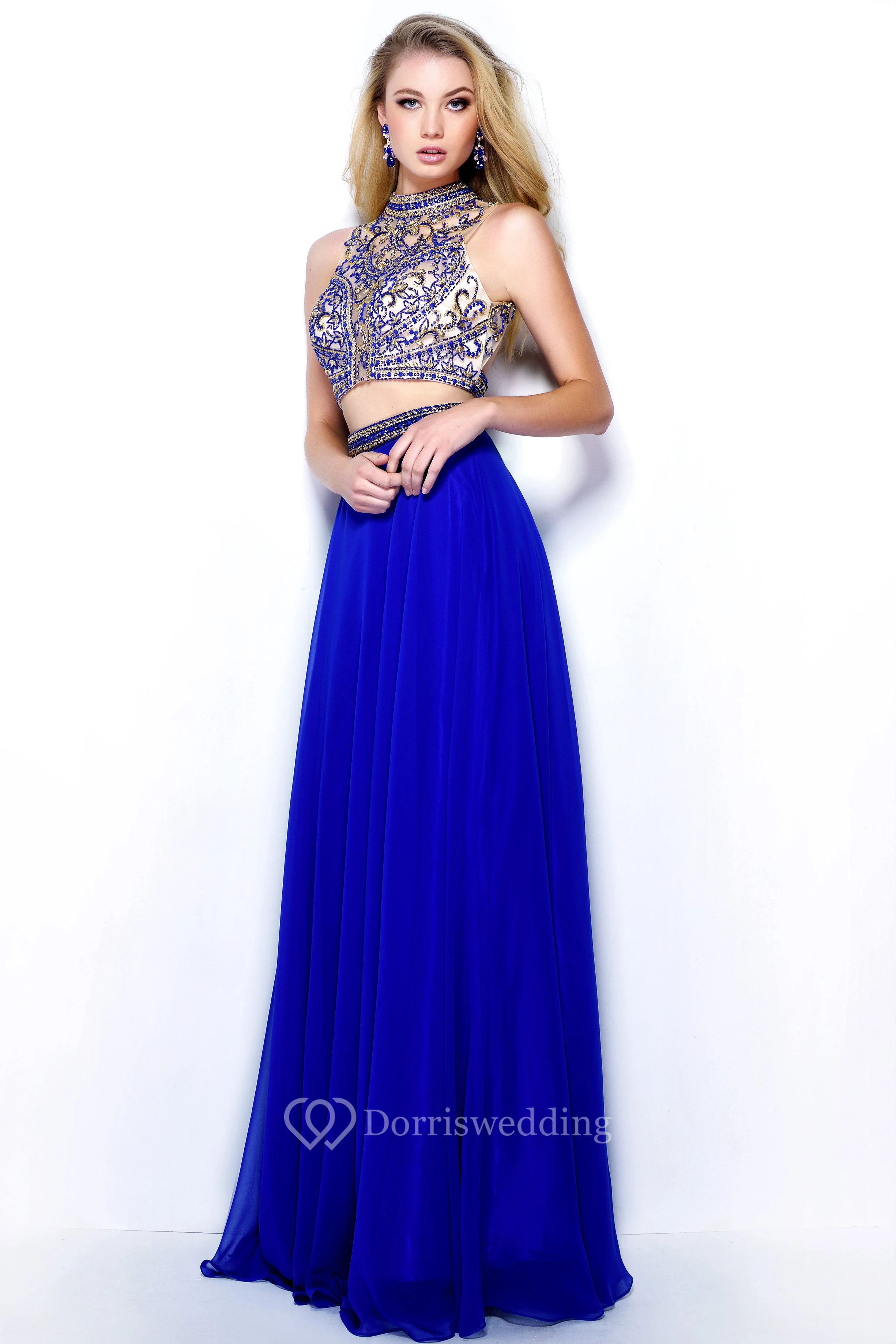 A-Line Long High Neck Sleeveless Chiffon Keyhole Dress With Beading And Pleats