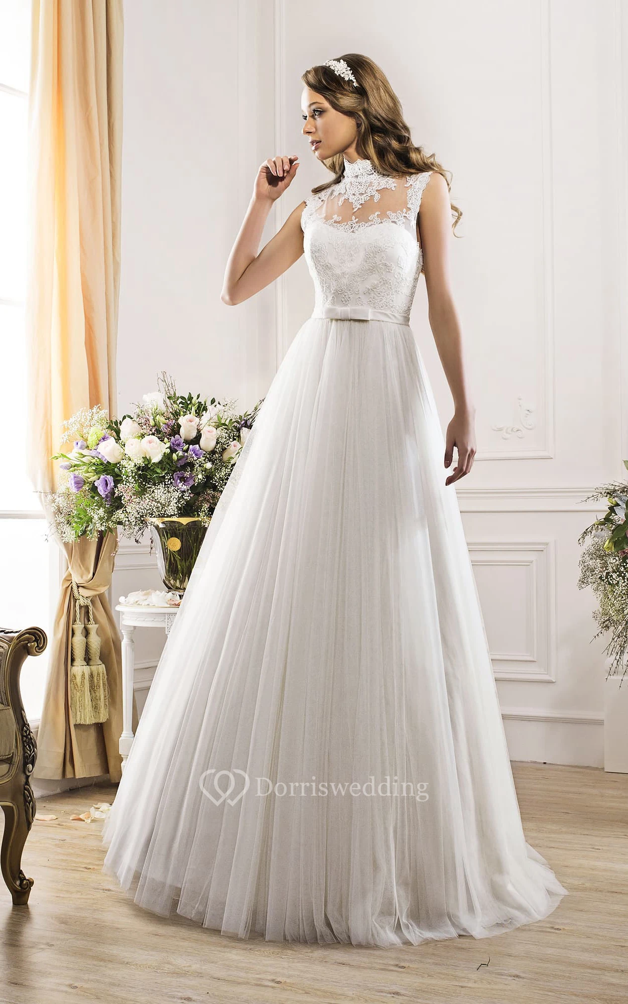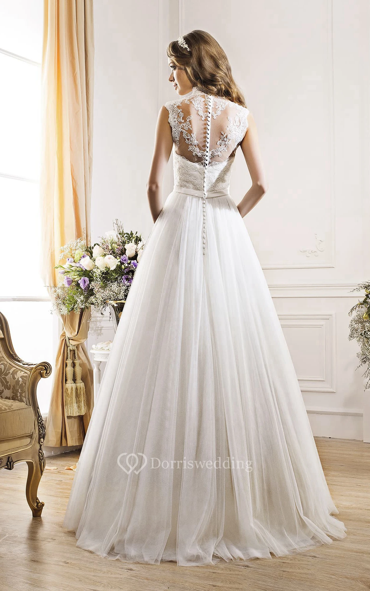 A-Line Long High-Neck Sleeveless Illusion Tulle Dress With Appliques