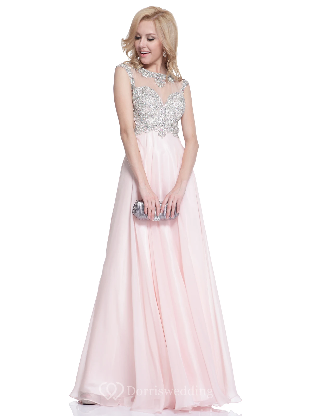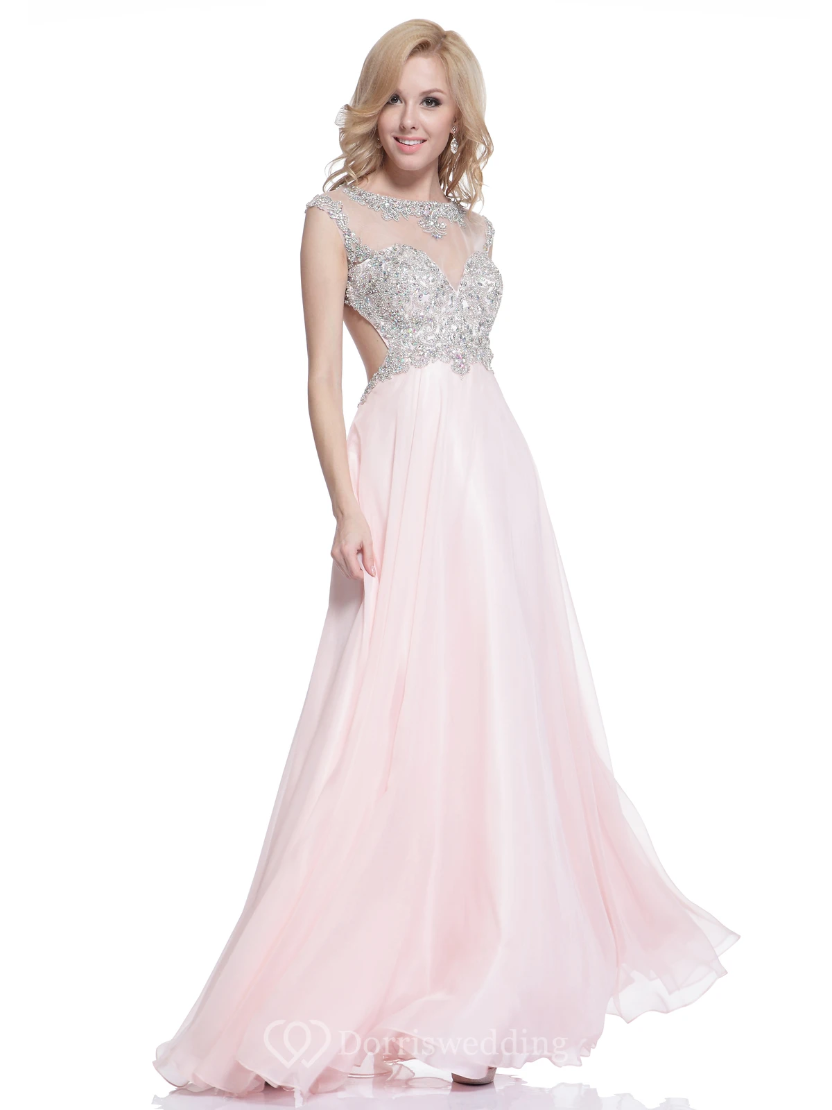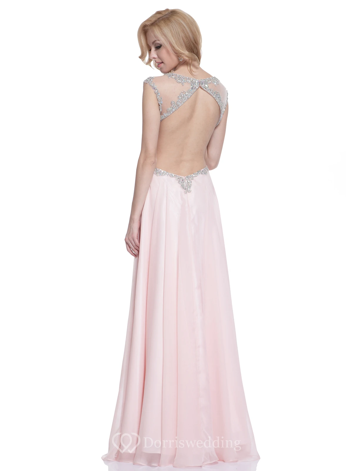 A-Line Long Jewel-Neck Cap-Sleeve Empire Backless Dress With Beading And Pleats