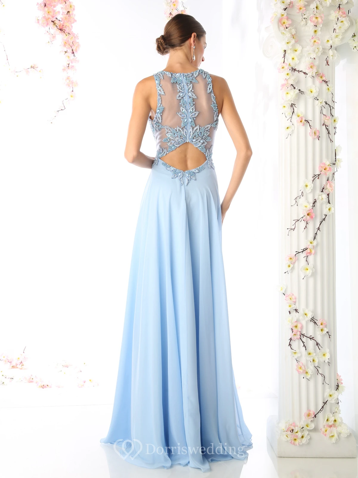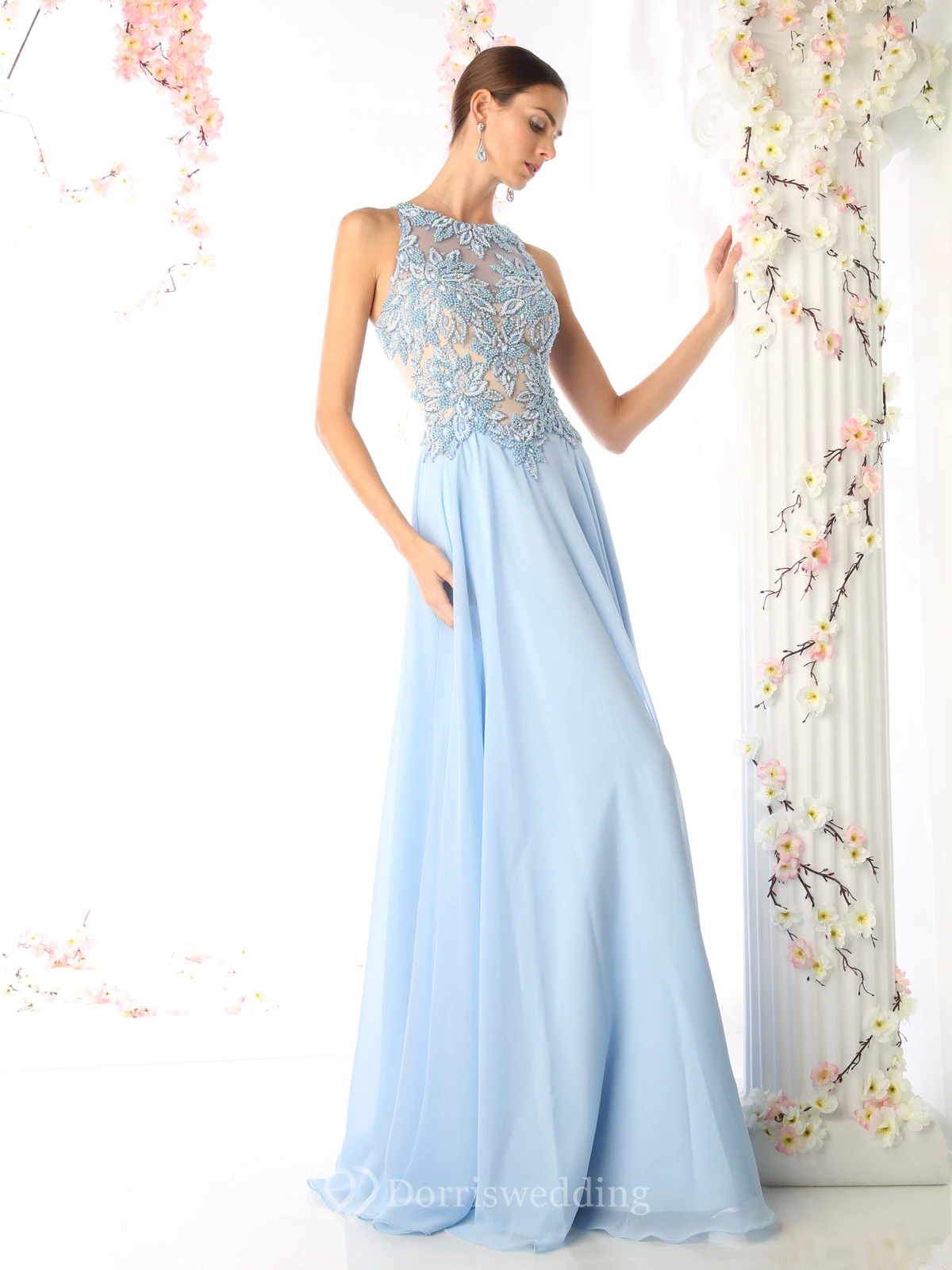 A-Line Long Jewel-Neck Sleeveless Chiffon Illusion Dress With Appliques And Beading