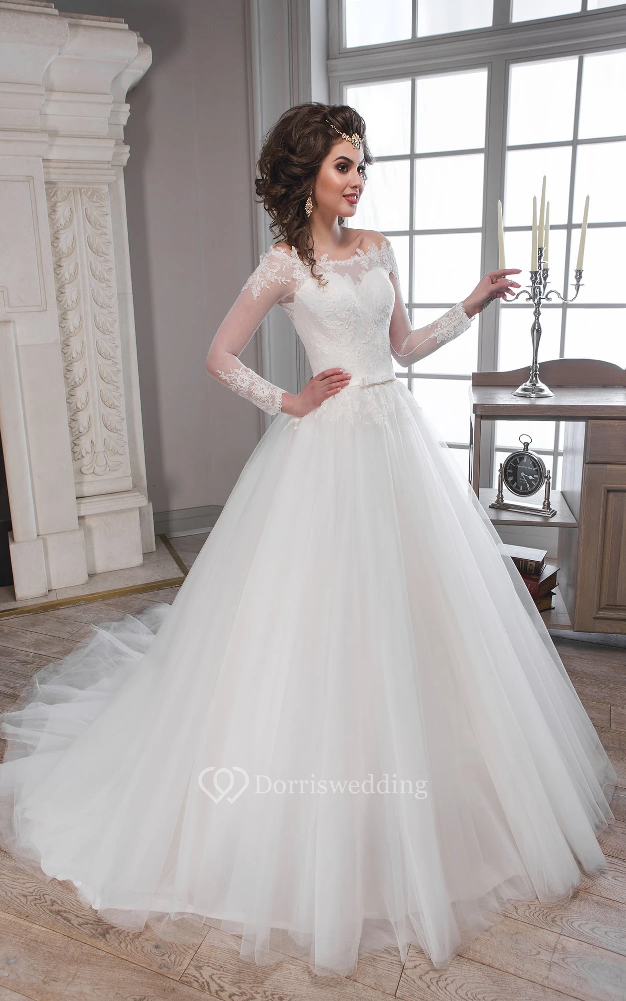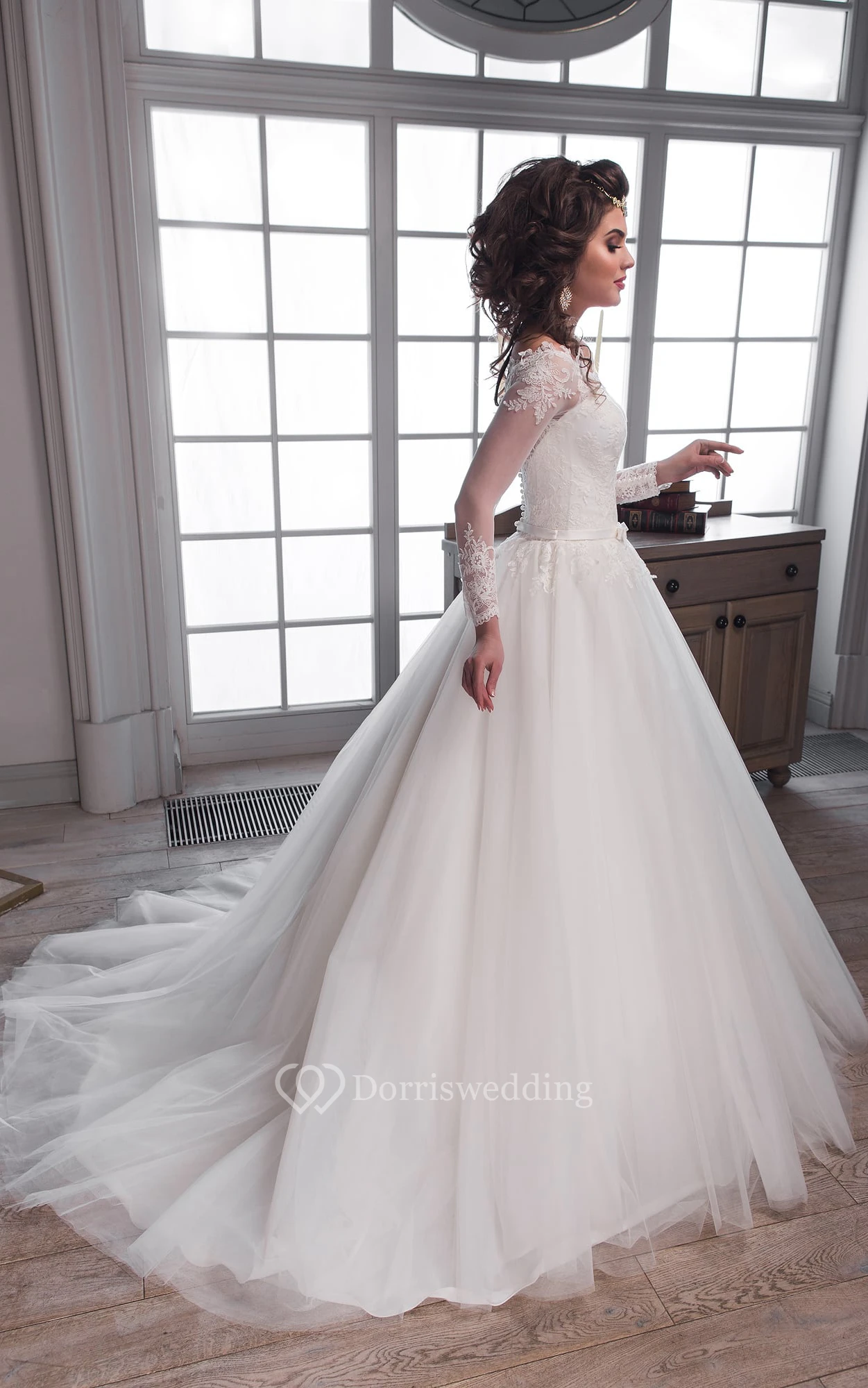 • Hemline/Train: Floor-length, Sweep/Brush Train