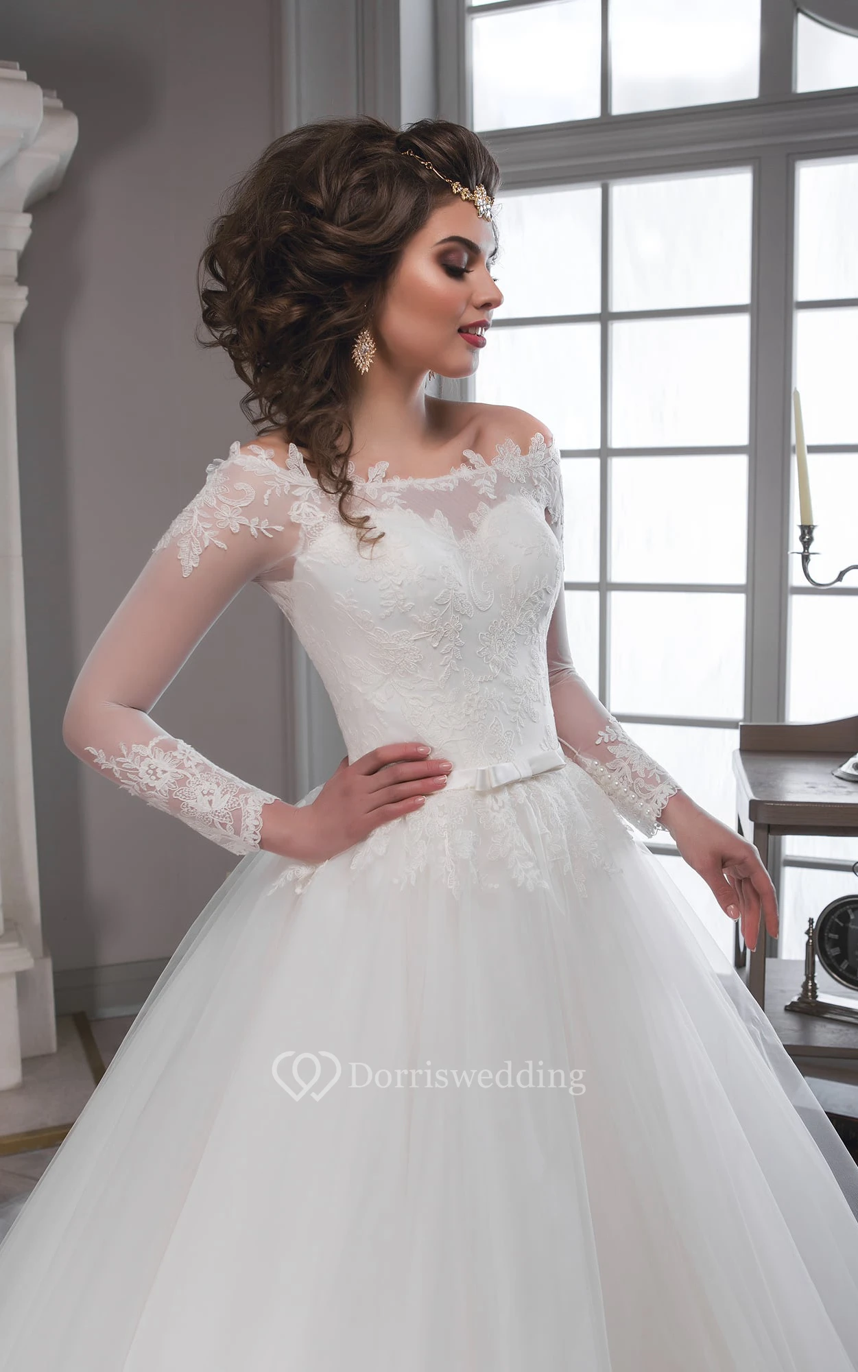 A-Line Long Off-The-Shoulder Long-Sleeve Illusion Tulle Dress With Appliques And Pleats