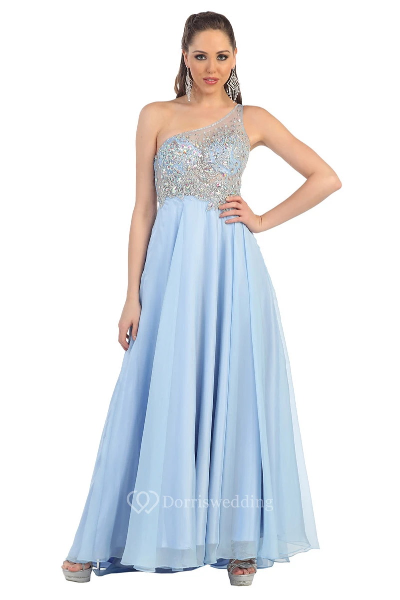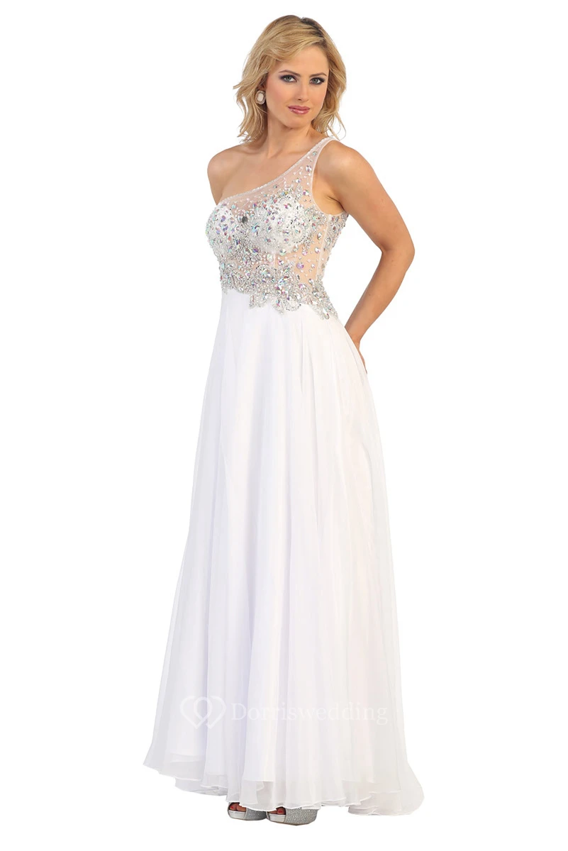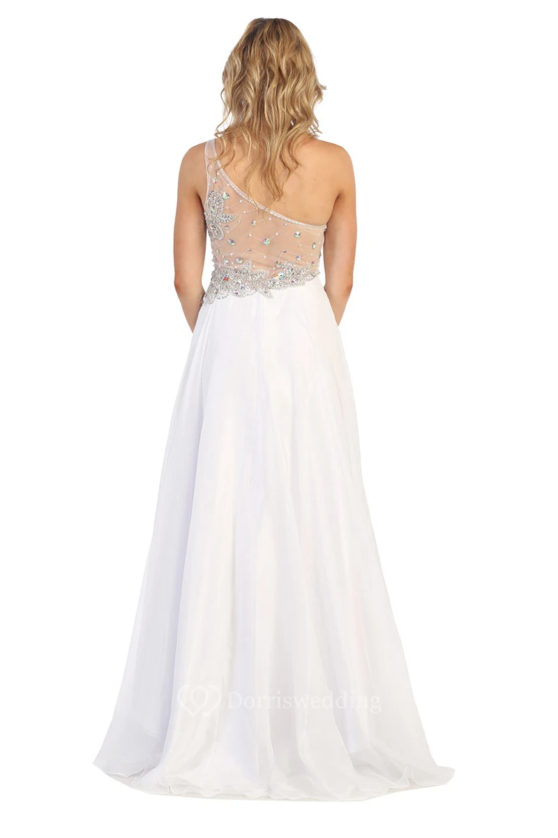 A-Line Long One-Shoulder Sleeveless Illusion Dress With Beading And Pleats