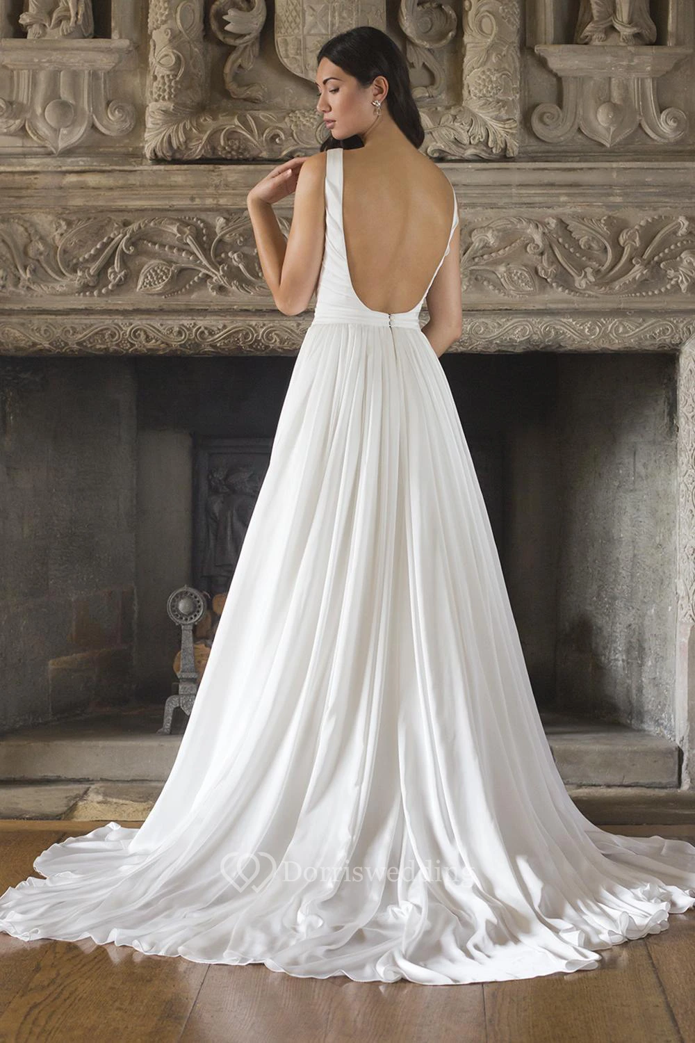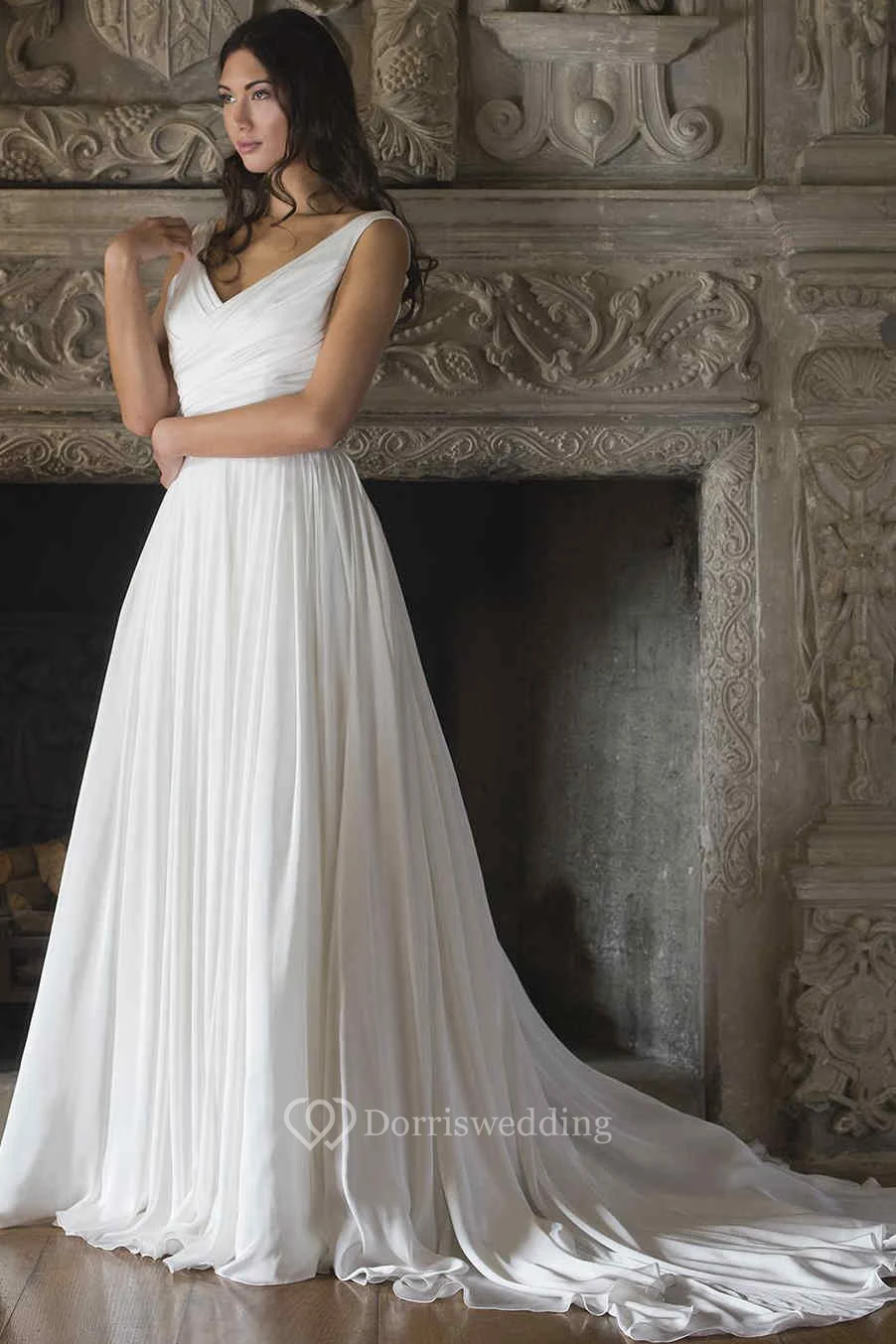 A-Line Long Pleated Sleeveless V-Neck Chiffon Wedding Dress With Ruching And Backless Design