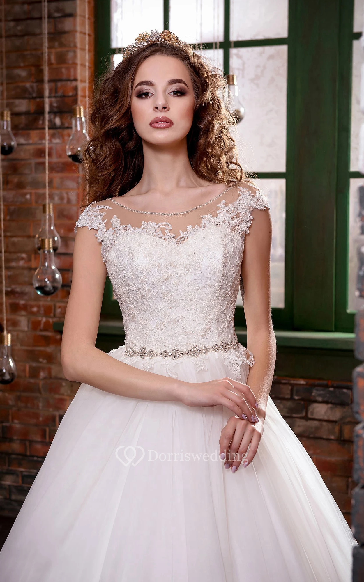 A-Line Long Scoop Cap-Sleeve Illusion Lace Dress With Appliques And Waist Jewellery