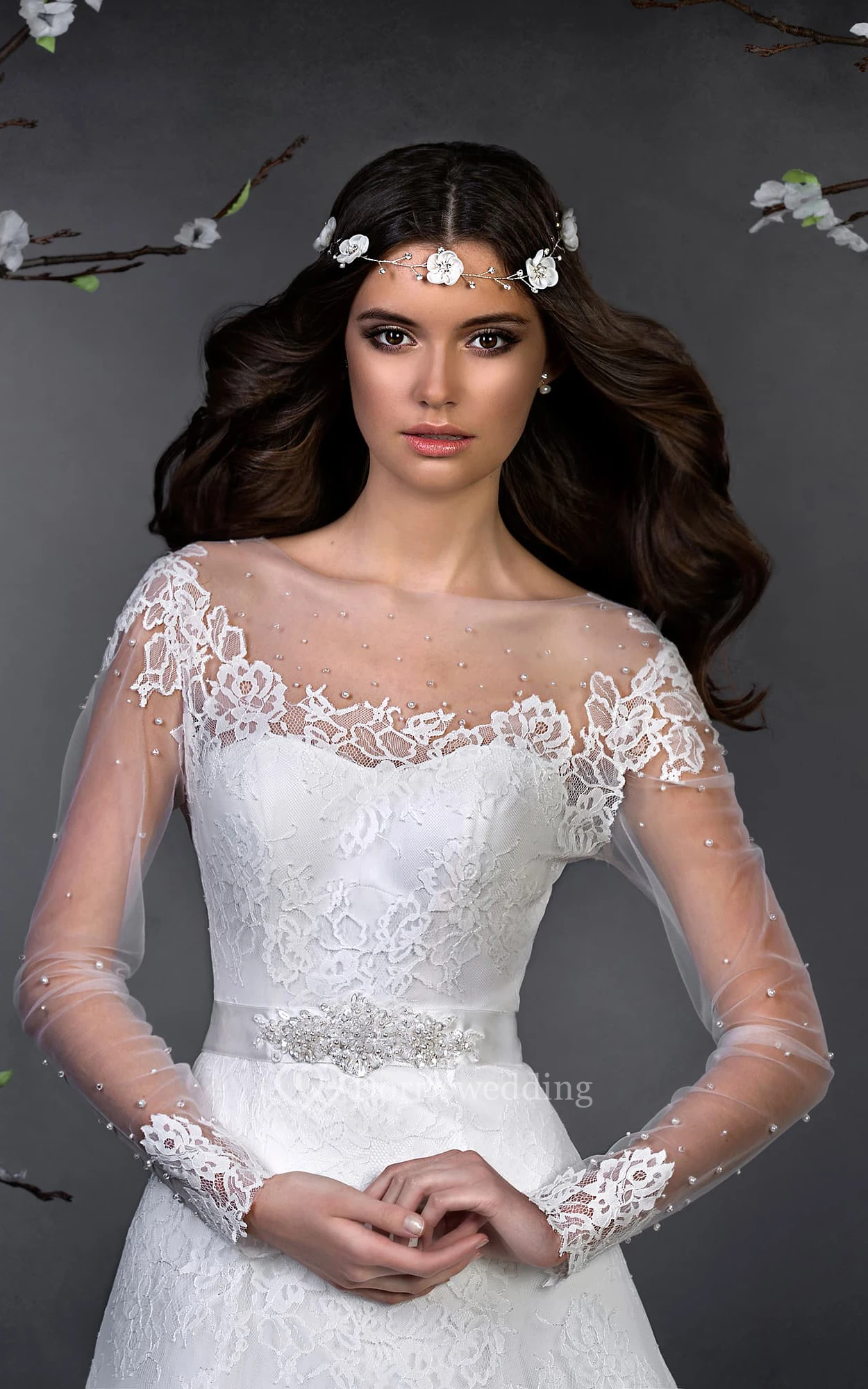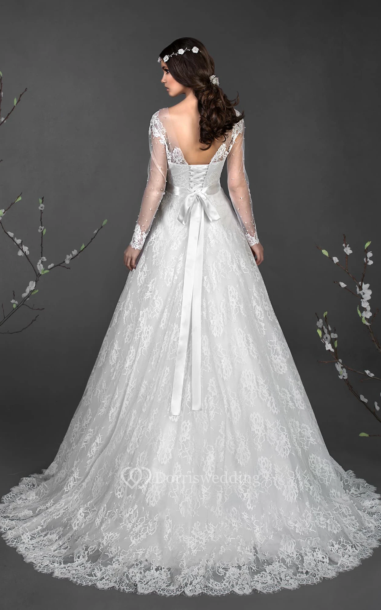 A-Line Long Scoop Long-Sleeve Corset-Back Lace Dress With Appliques And Waist Jewellery