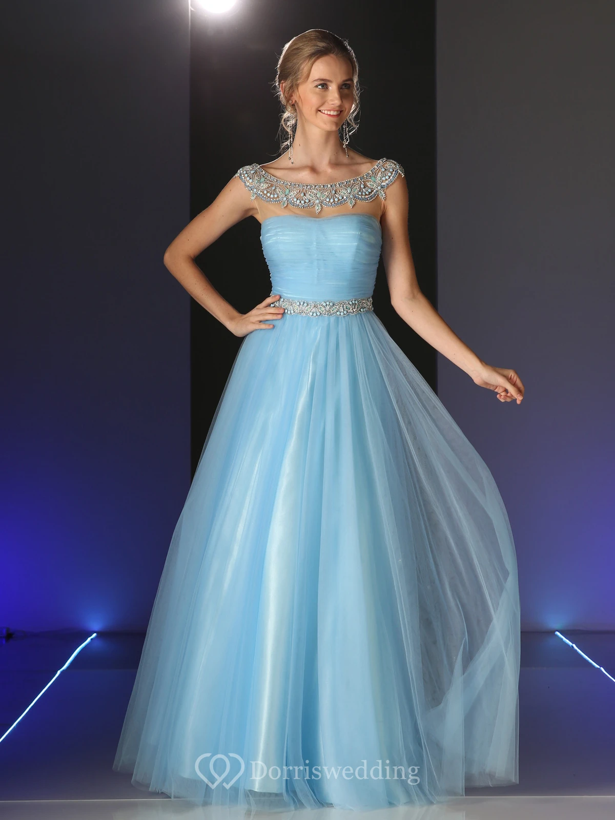 A-Line Long Scoop-Neck Cap-Sleeve Tulle Illusion Dress With Beading And Ruching