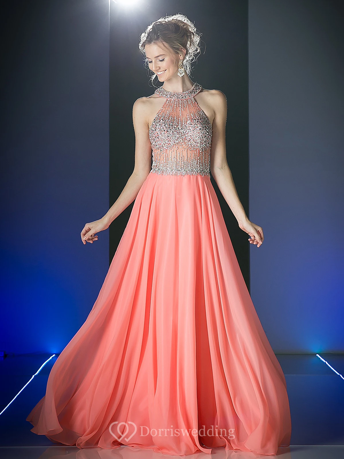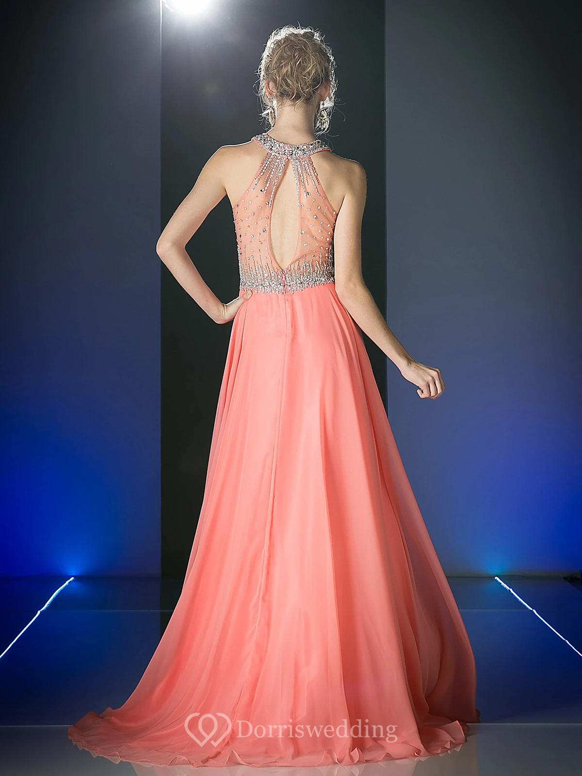 A-Line Long Scoop-Neck Sleeveless Chiffon Illusion Dress With Beading And Pleats