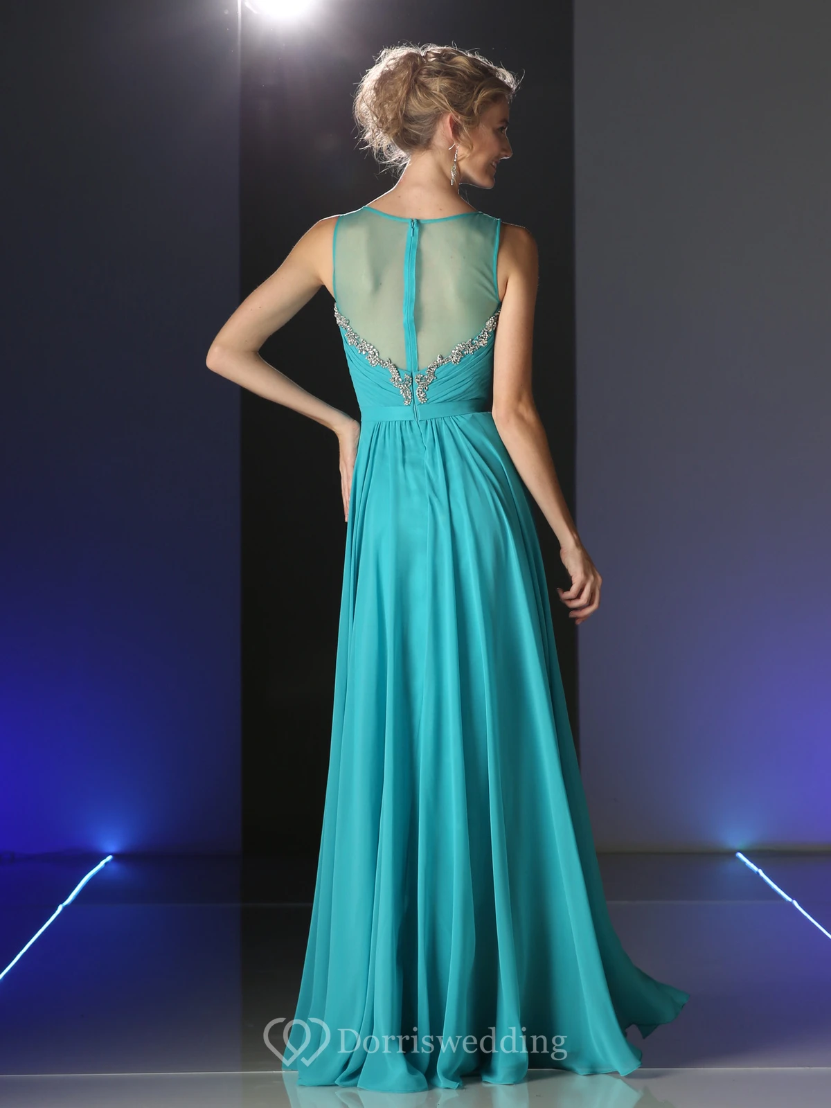 A-Line Long Scoop-Neck Sleeveless Chiffon Illusion Dress With Ruching And Beading