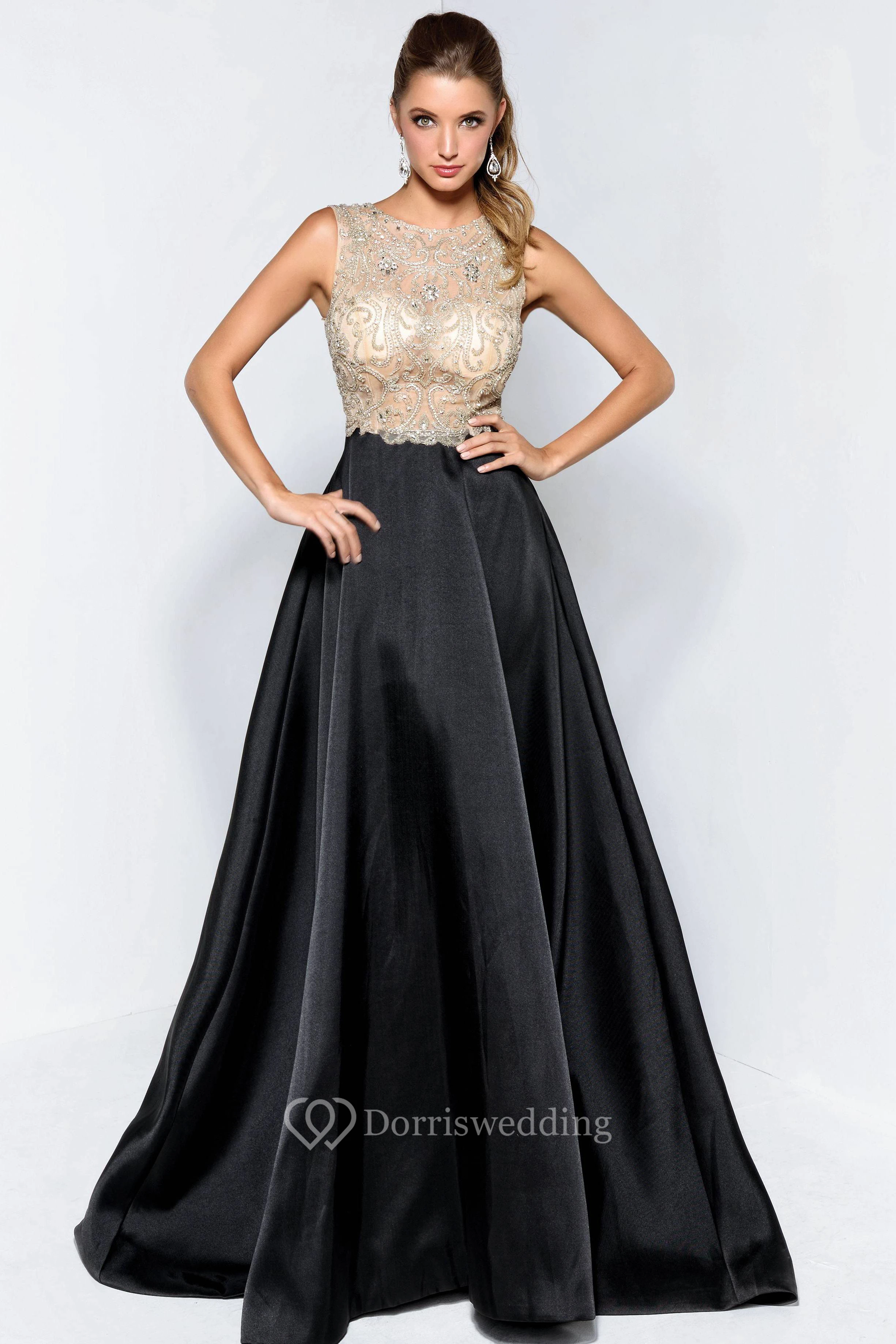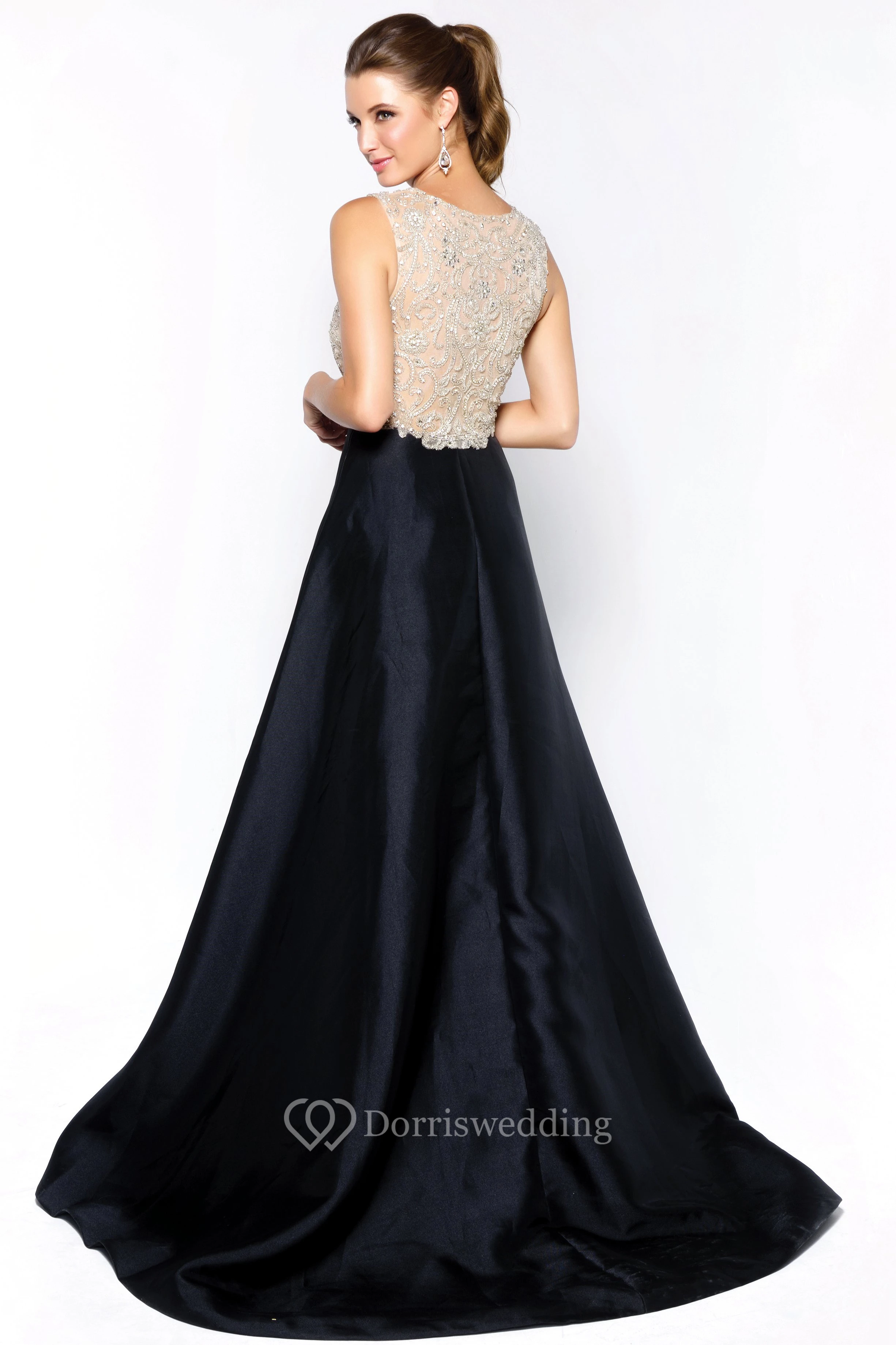 A-Line Long Scoop-Neck Sleeveless Satin Court Train Illusion Dress With Beading
