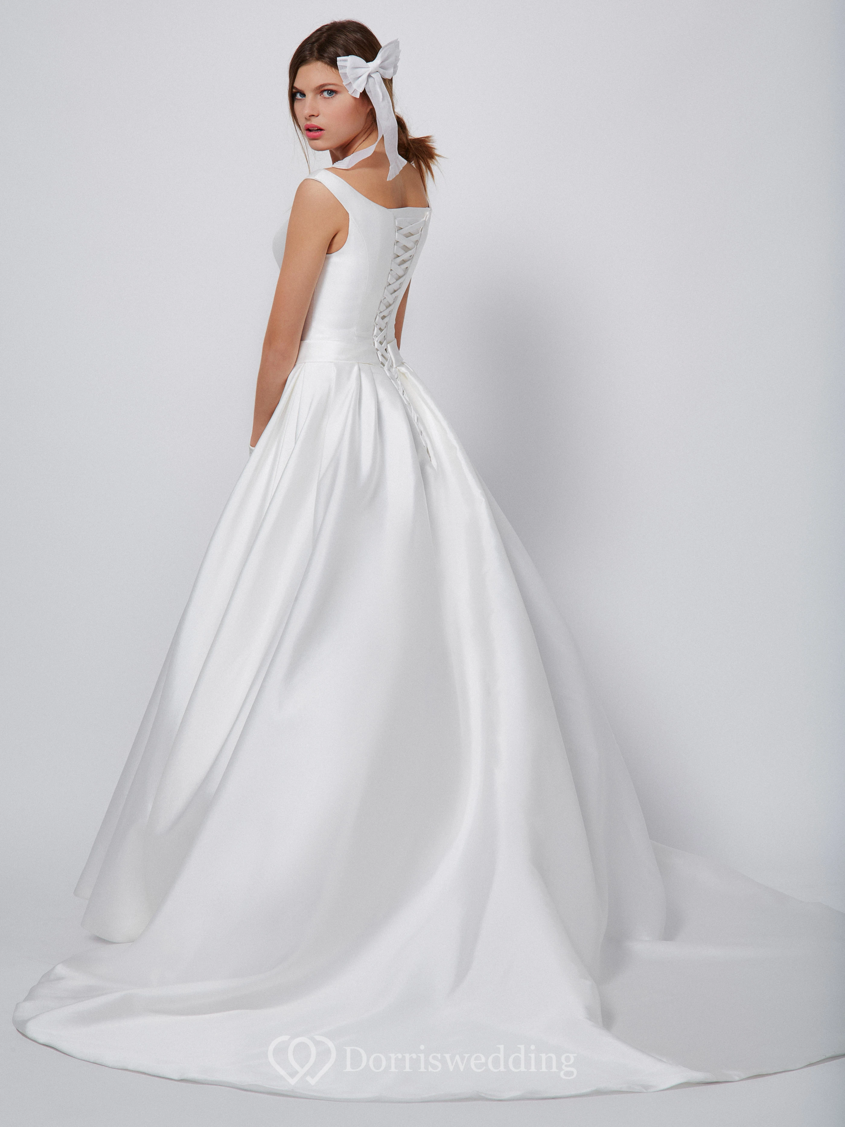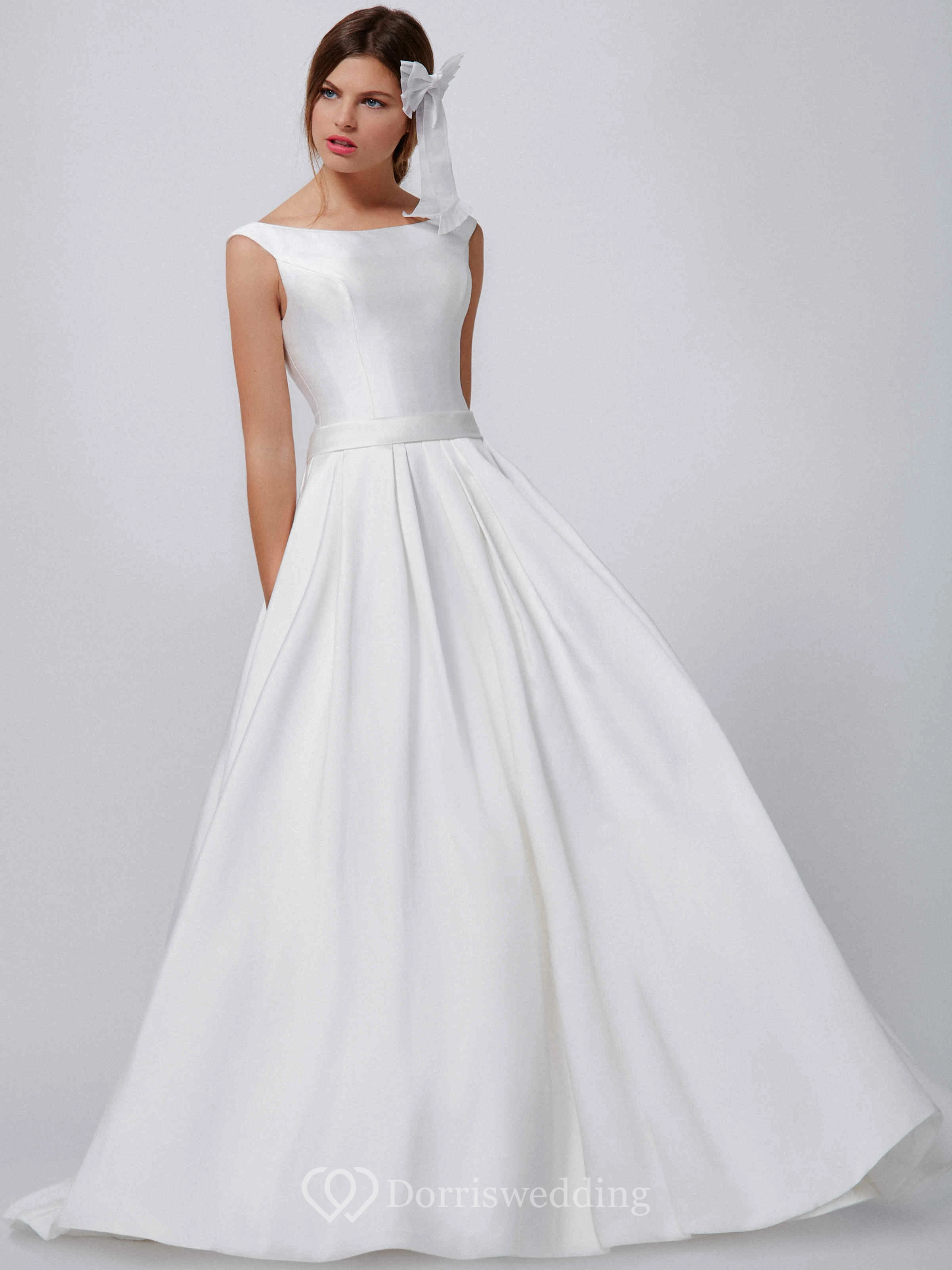 A-Line Long Scoop-Neck Sleeveless Satin Simple Wedding Dress