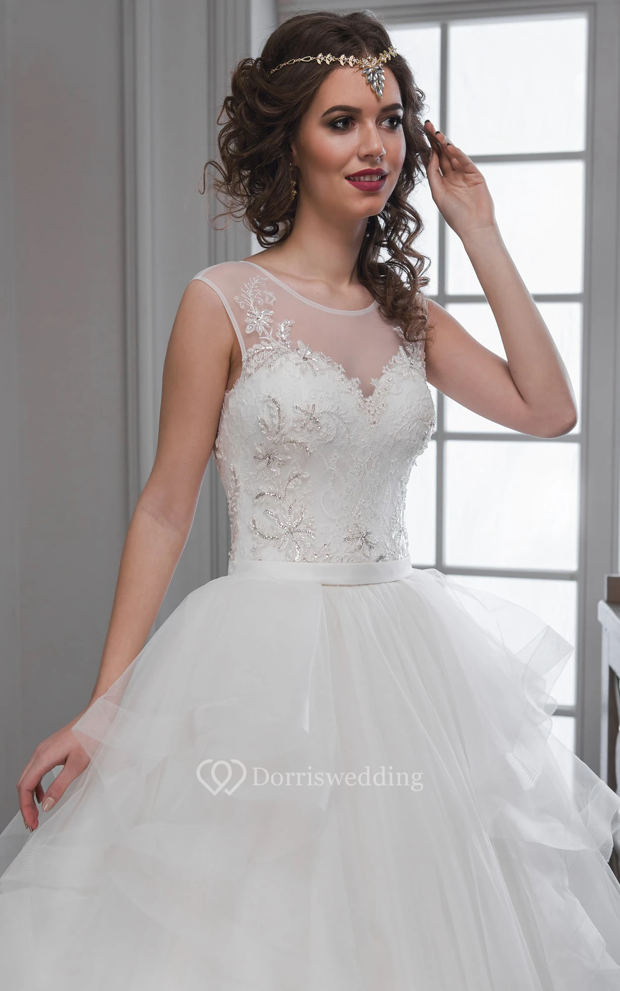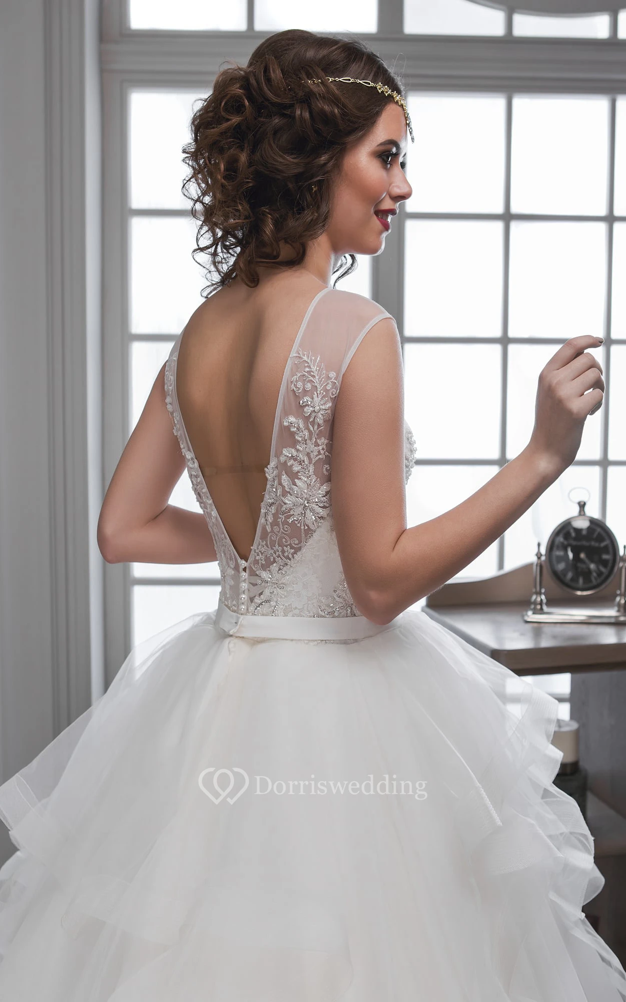 A-Line Long Scoop Sleeveless Deep-V-Back Tulle Dress With Ruffles And Beading