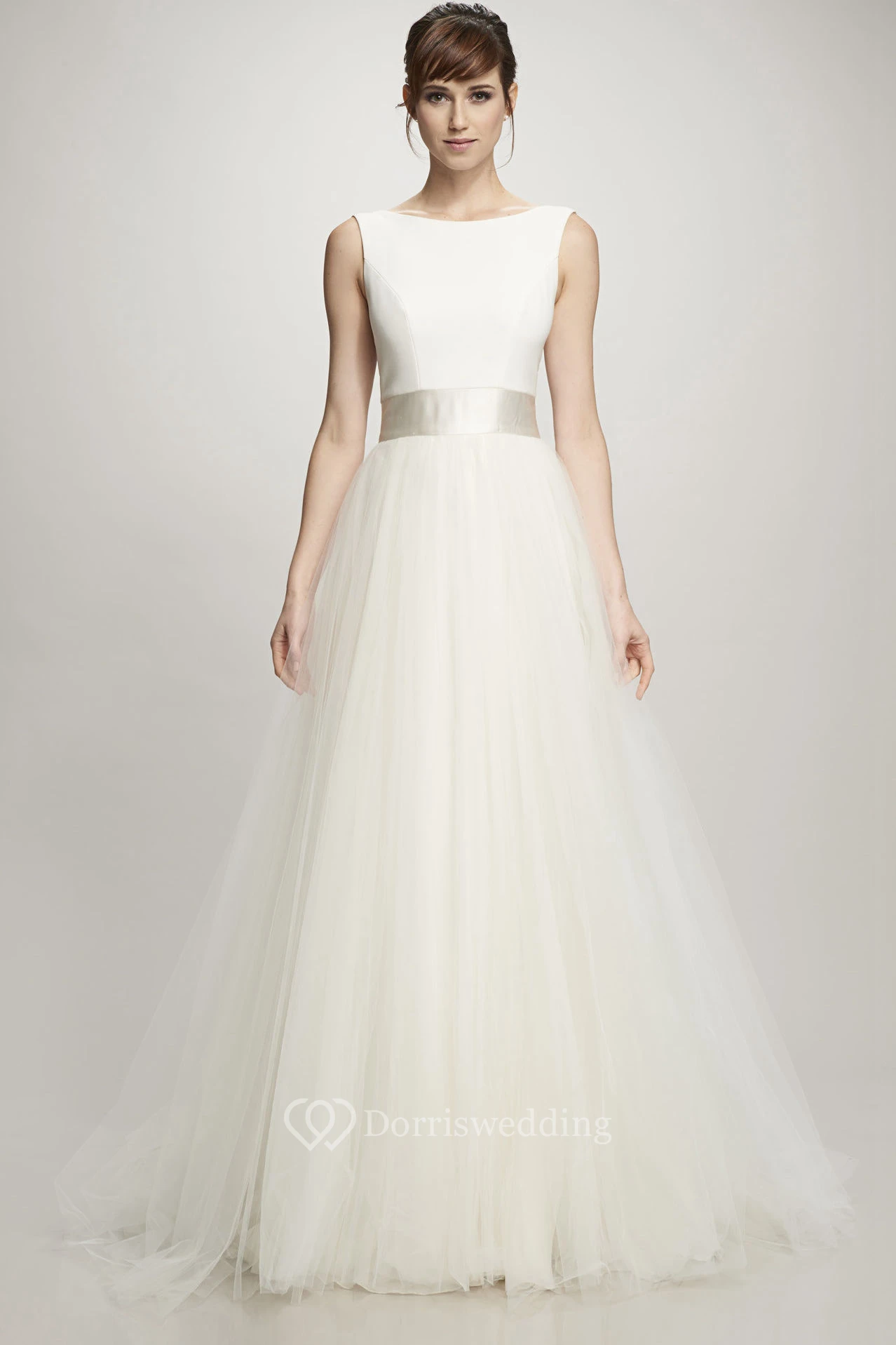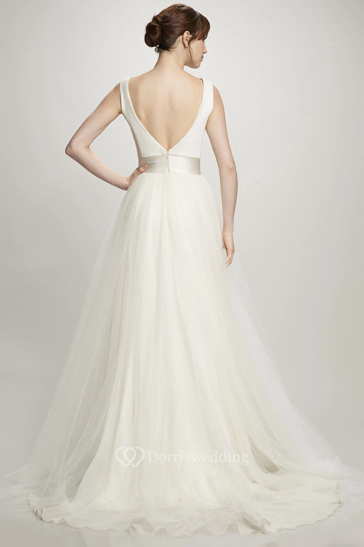 A-Line Long Scoop Sleeveless Satin&Tulle Wedding Dress With Low-V Back And Court Train
