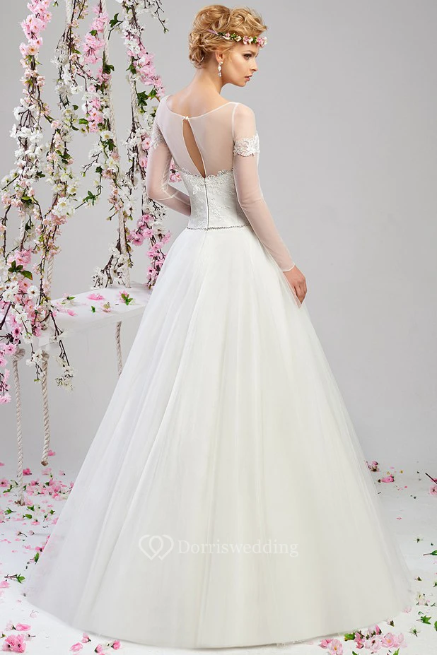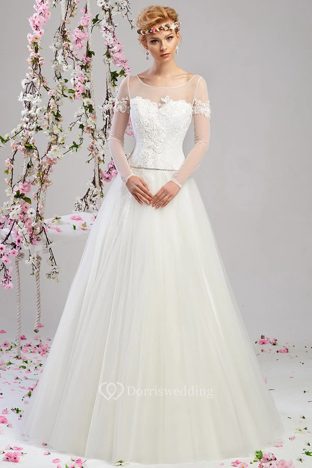 A-Line Long-Sleeve Long Appliqued Scoop-Neck Tulle Wedding Dress