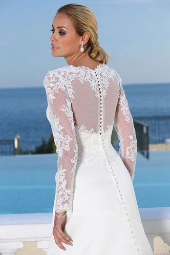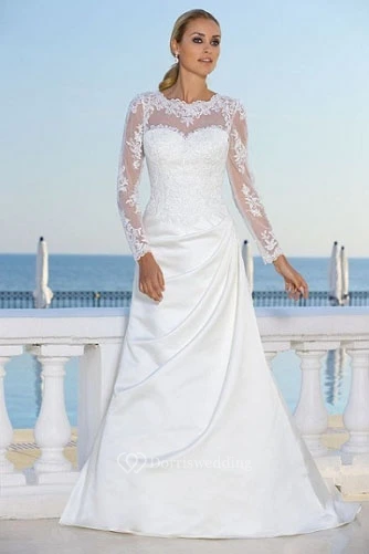 A-Line Long-Sleeve Scoop-Neck Maxi Draped Satin Wedding Dress With Appliques And Illusion