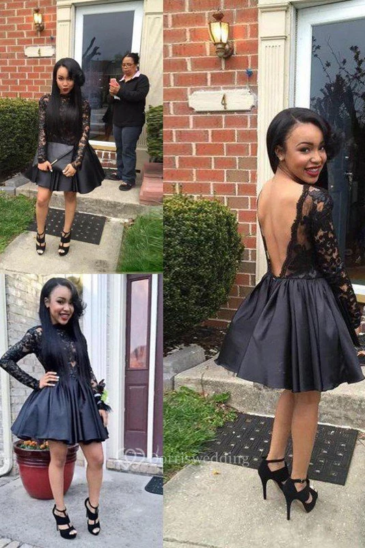 A-line Long Sleeve Taffeta Lace High Neck Deep-V Back Short Mini Homecoming Dress