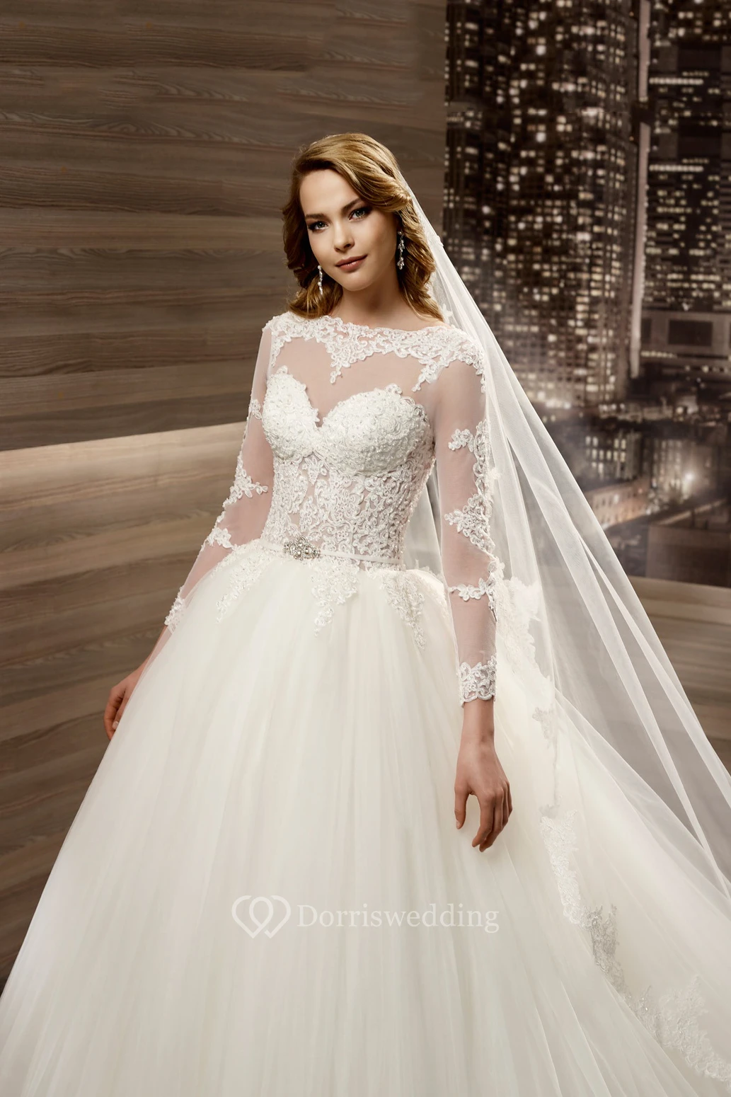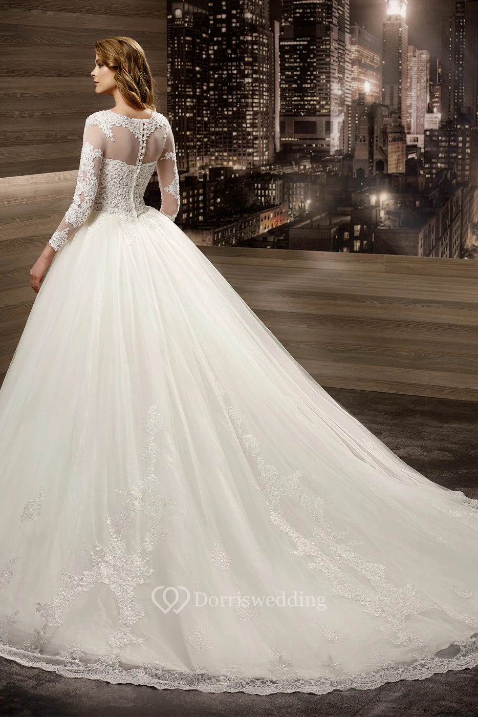 A-line Long-sleeve Wedding Gown with Lace Appliques Bodice and Brush Train