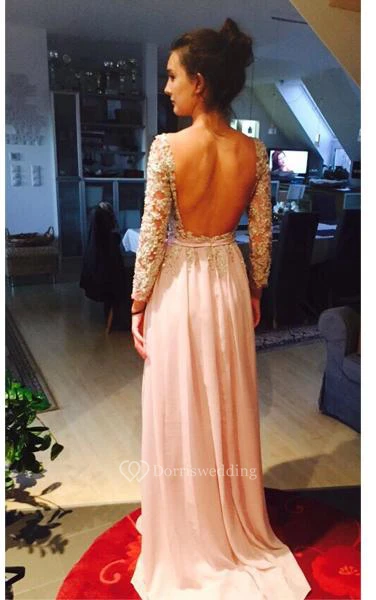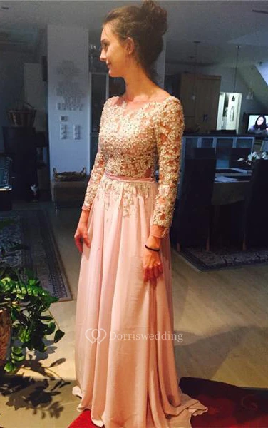 A-line Long-sleeved Chiffon Dress with lace Bodice