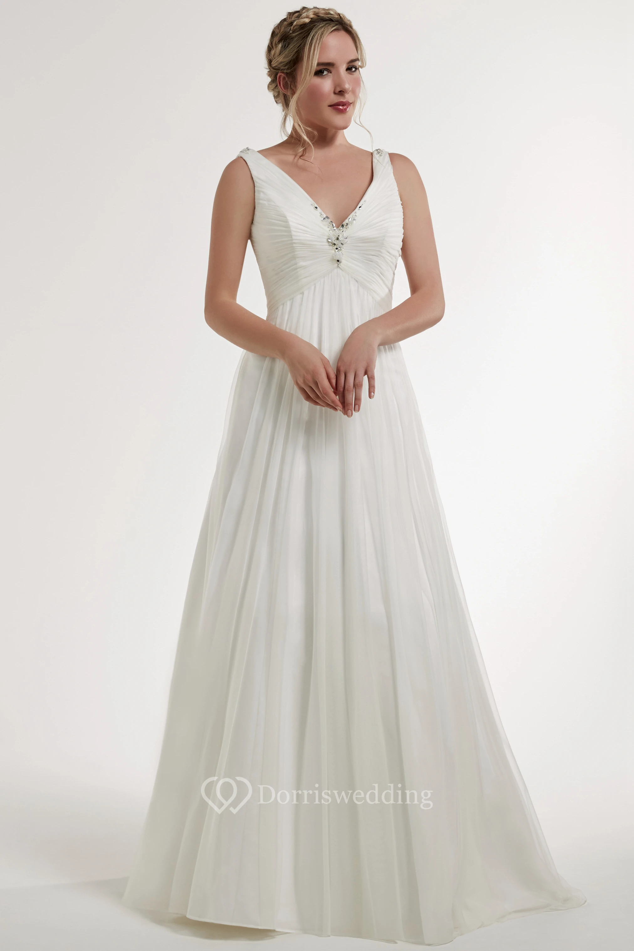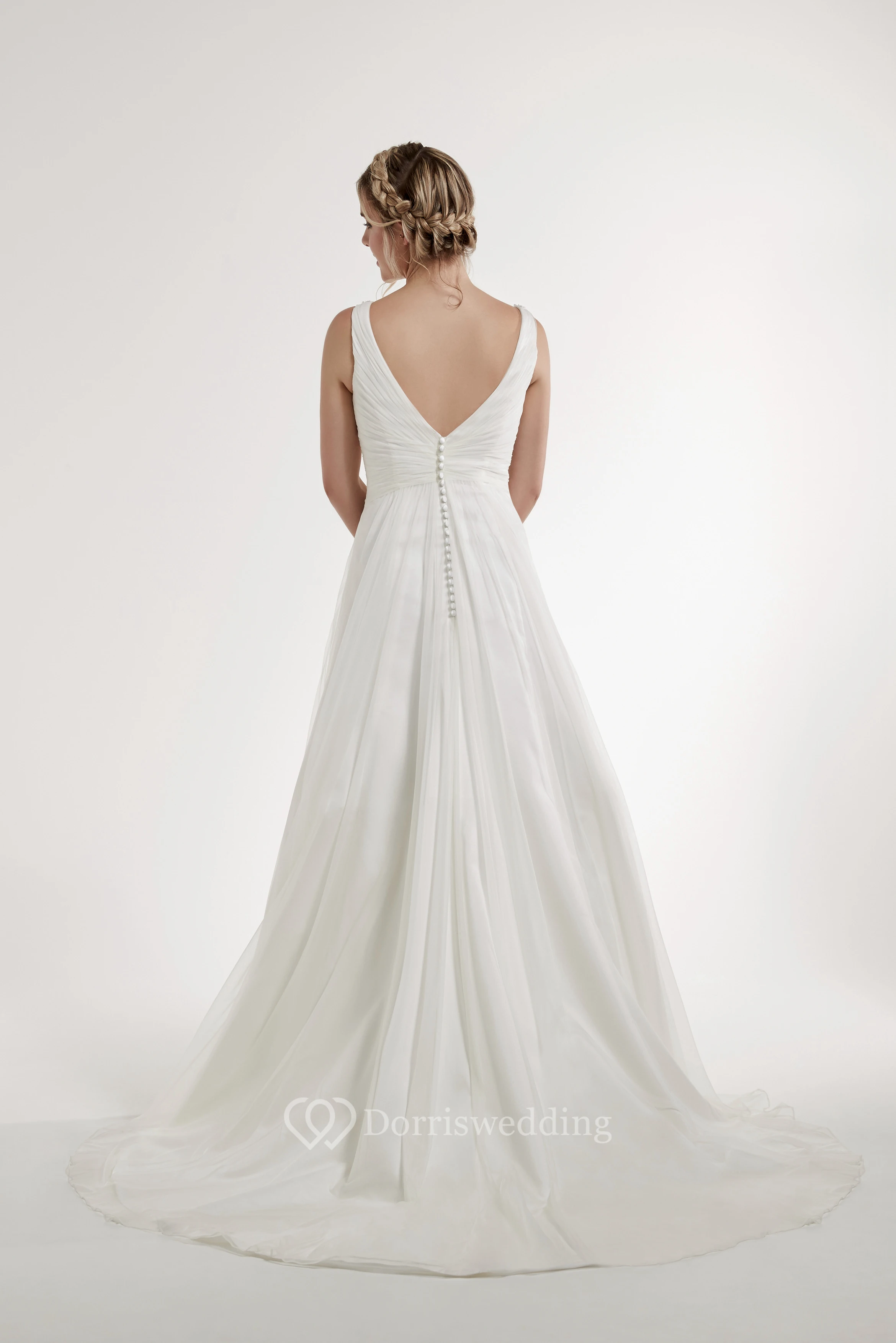 A-Line Long Sleeveless Beaded V-Neck Wedding Dress With Low-V Back And Ruching