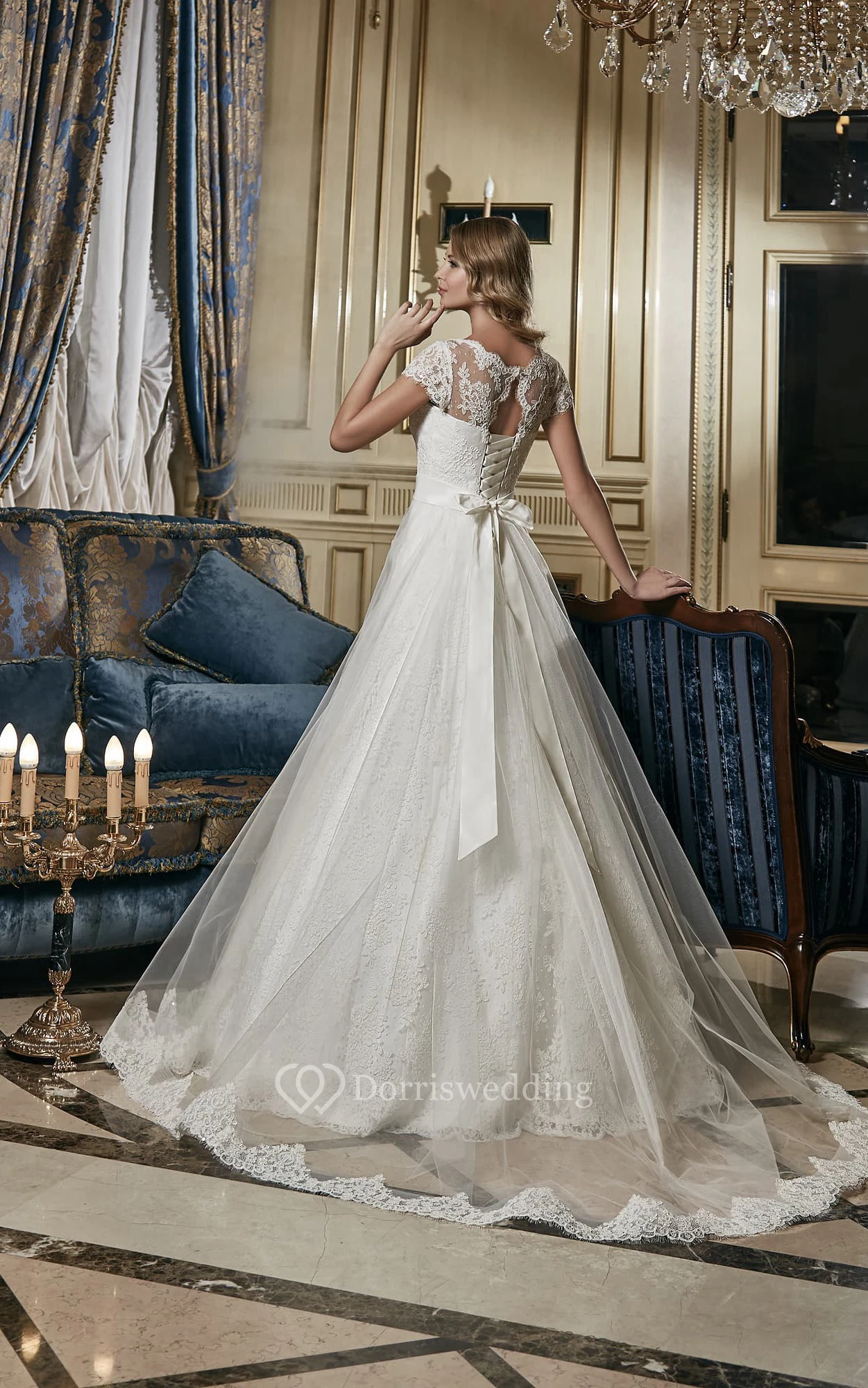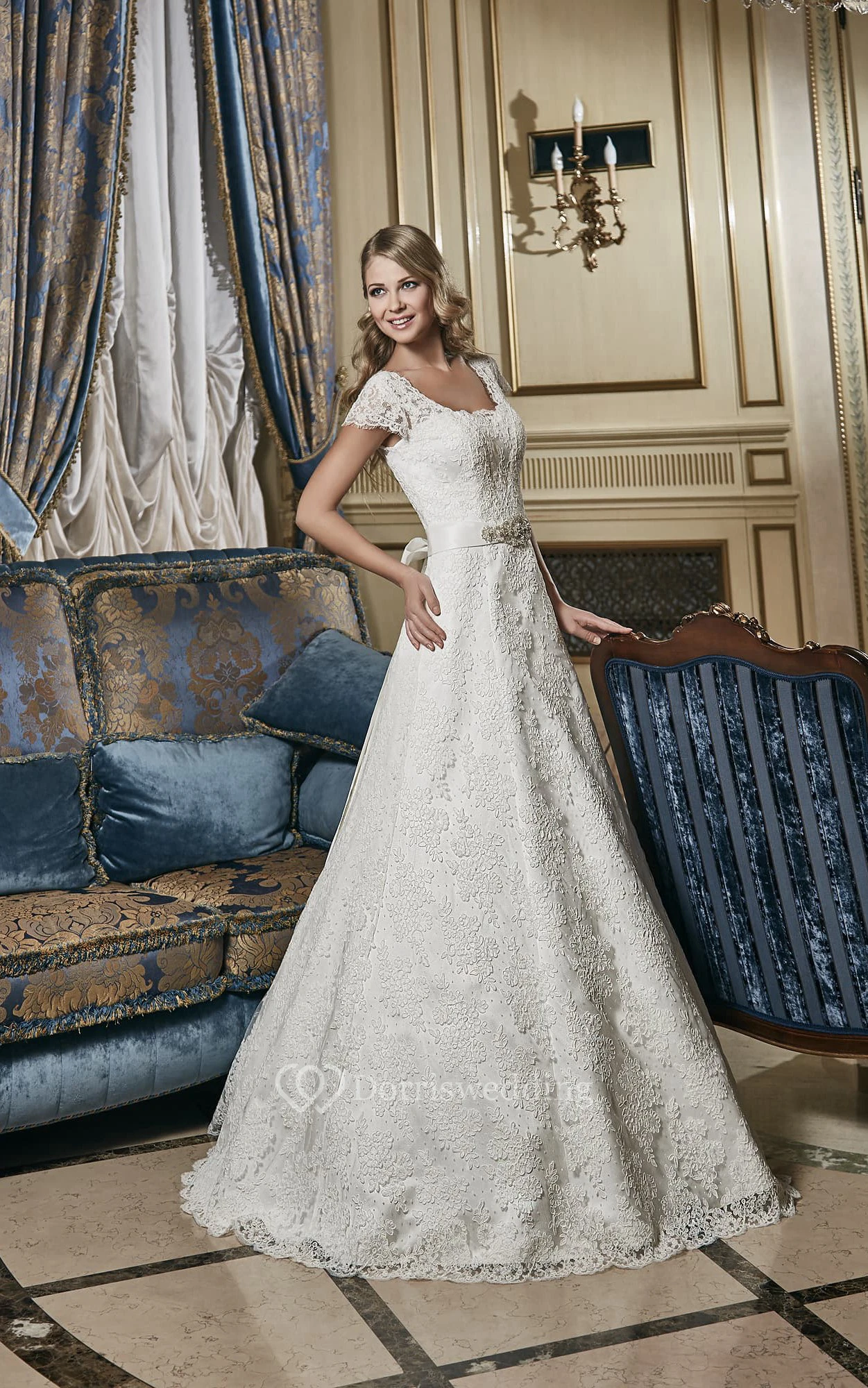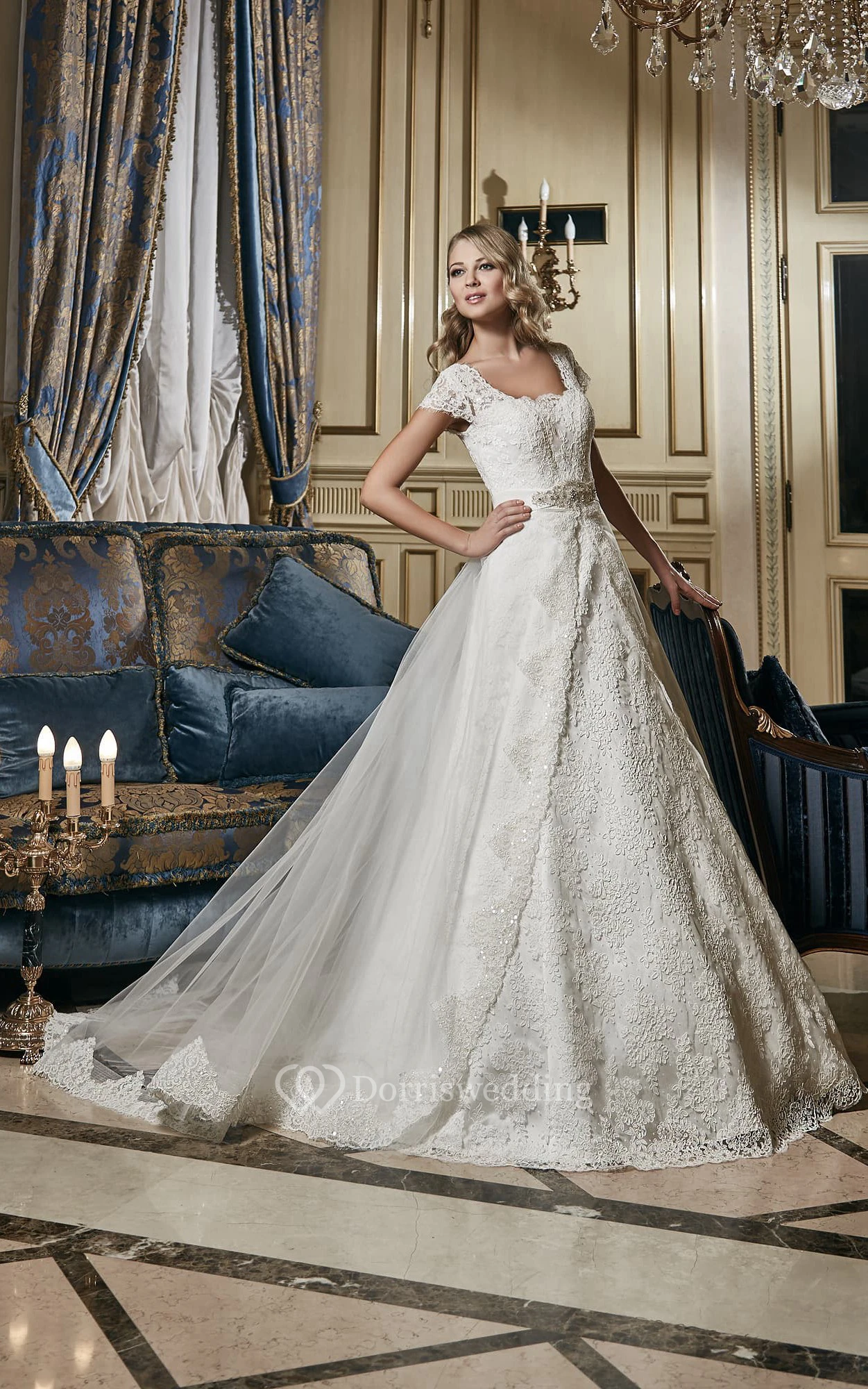 A-Line Long Square-Neck Cap-Sleeve Lace-Up Lace Bridal Dress With Beaded