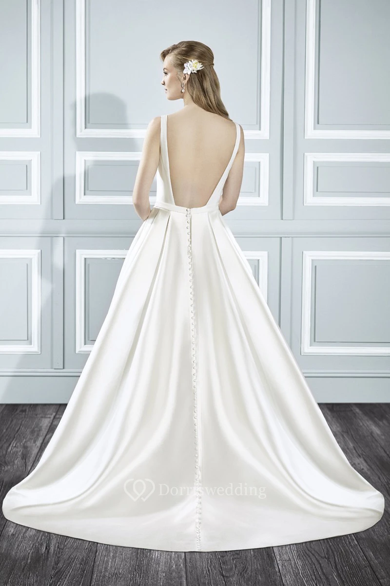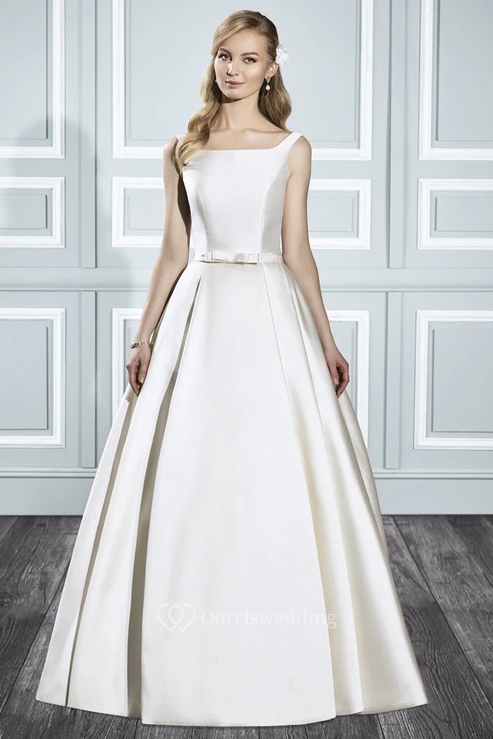 A-Line Long Square Sleeveless Satin Wedding Dress With Court Train And Backless Style