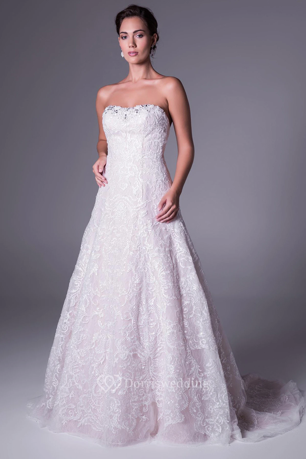 A-Line Long Strapless Lace Wedding Dress With Beading And Deep-V Back