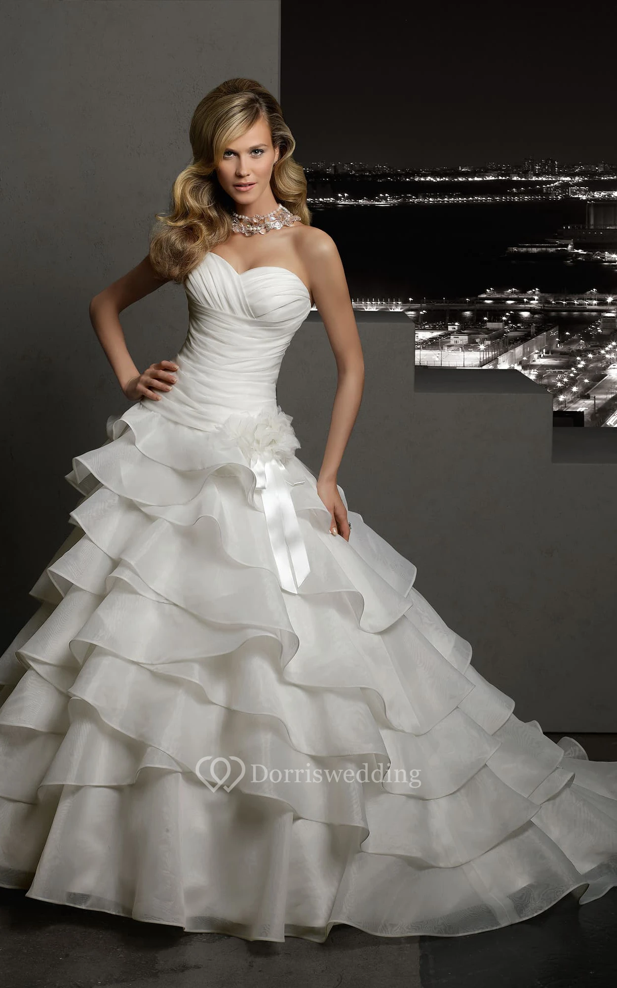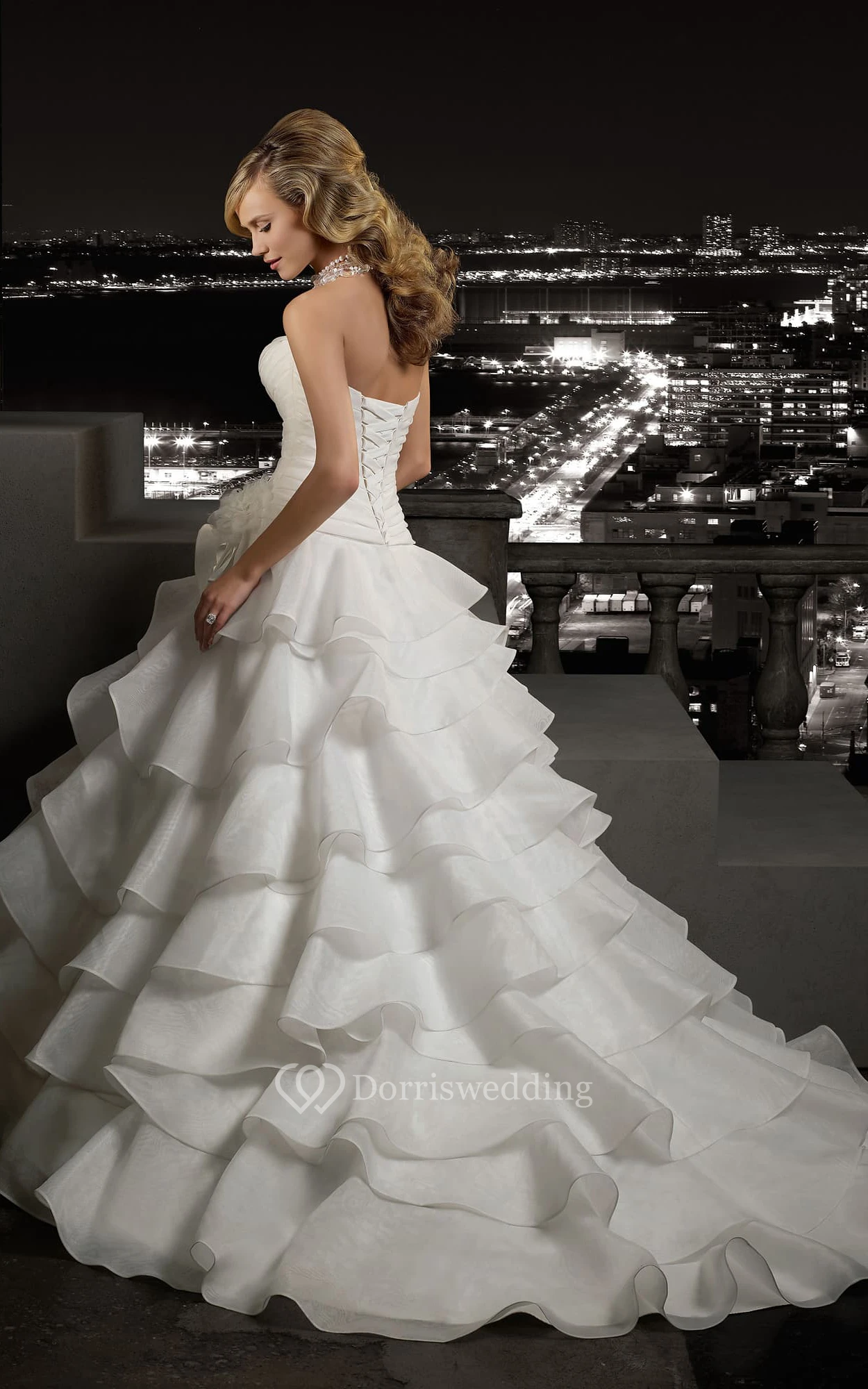 A-Line Long Sweetheart Sleeveless Lace-Up Organza Dress With Tiers And Flower