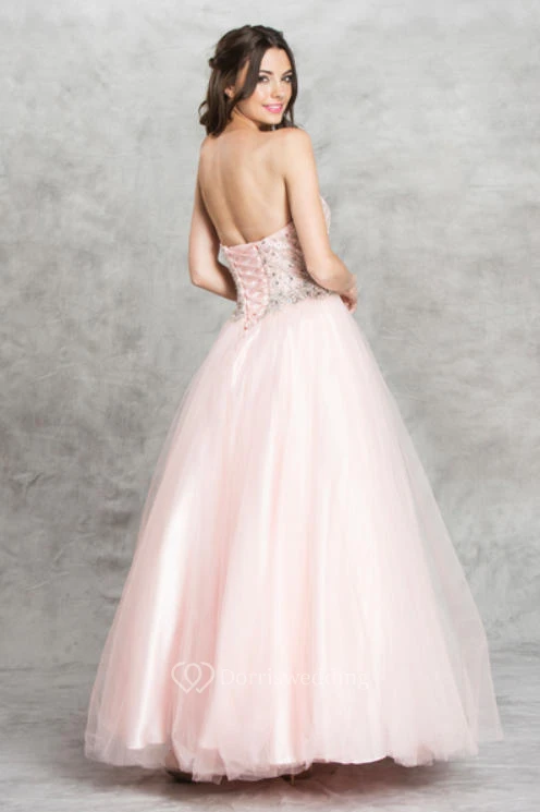 A-Line Long Sweetheart Sleeveless Tulle Satin Backless Dress With Beading