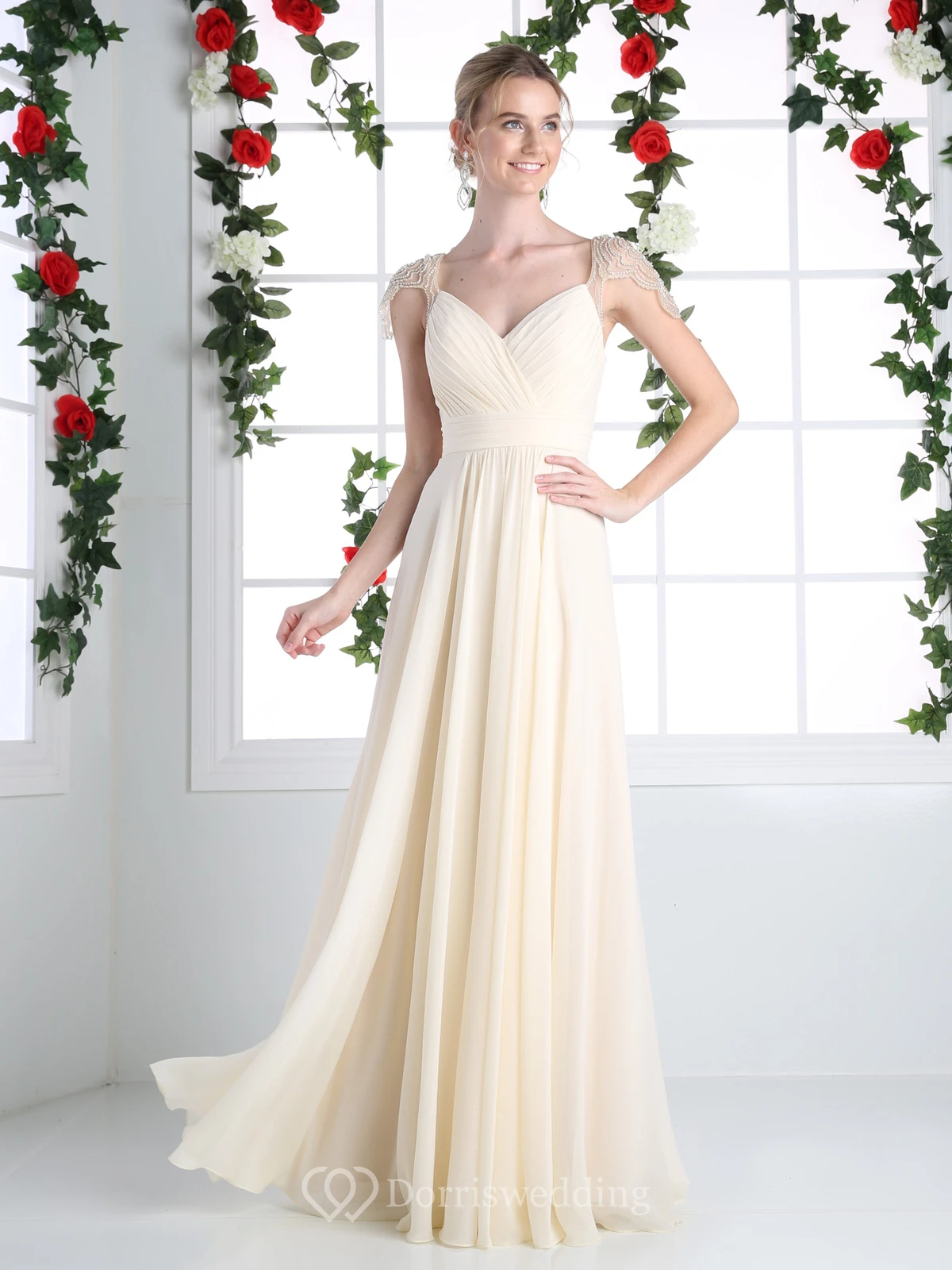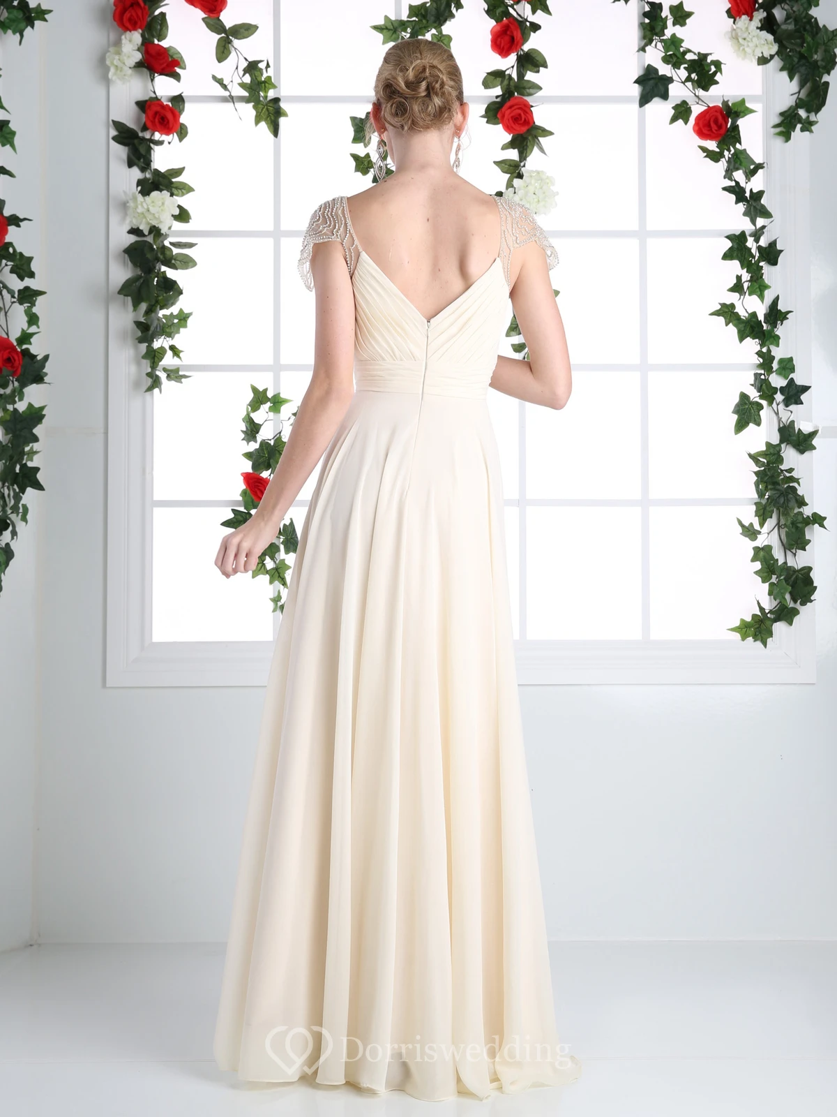 A-Line Long V-Neck Cap-Sleeve Chiffon Low-V Back Dress With Beading And Ruching