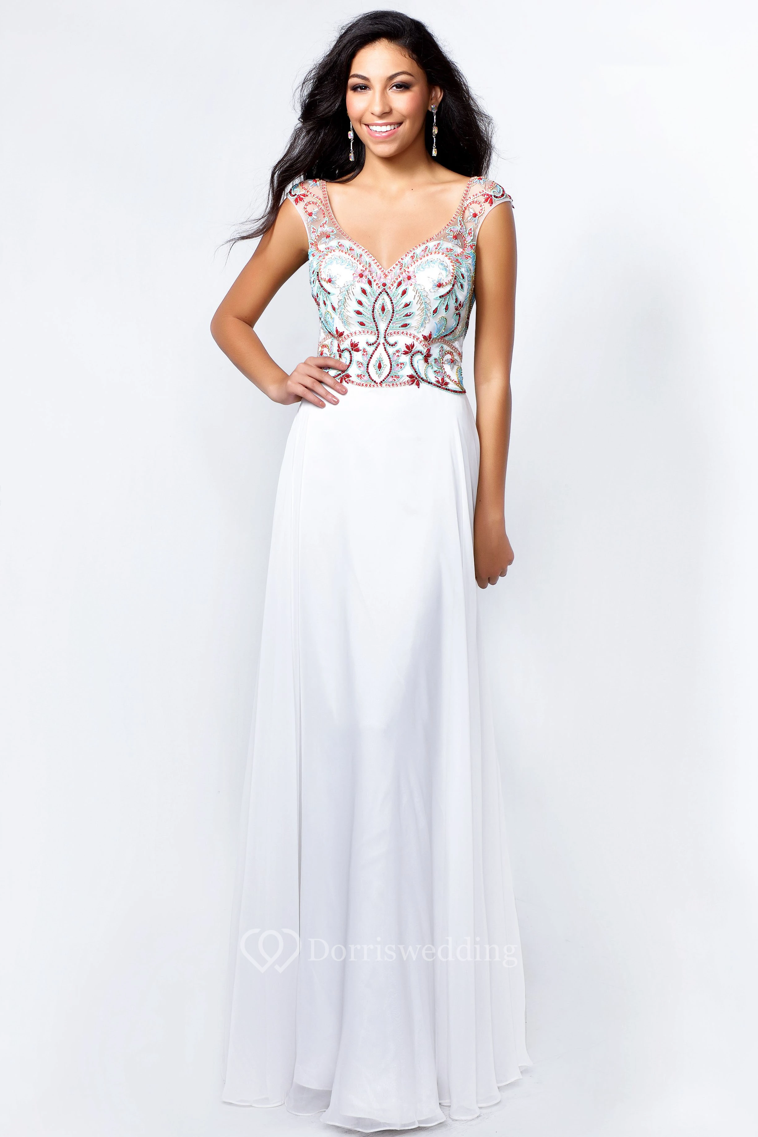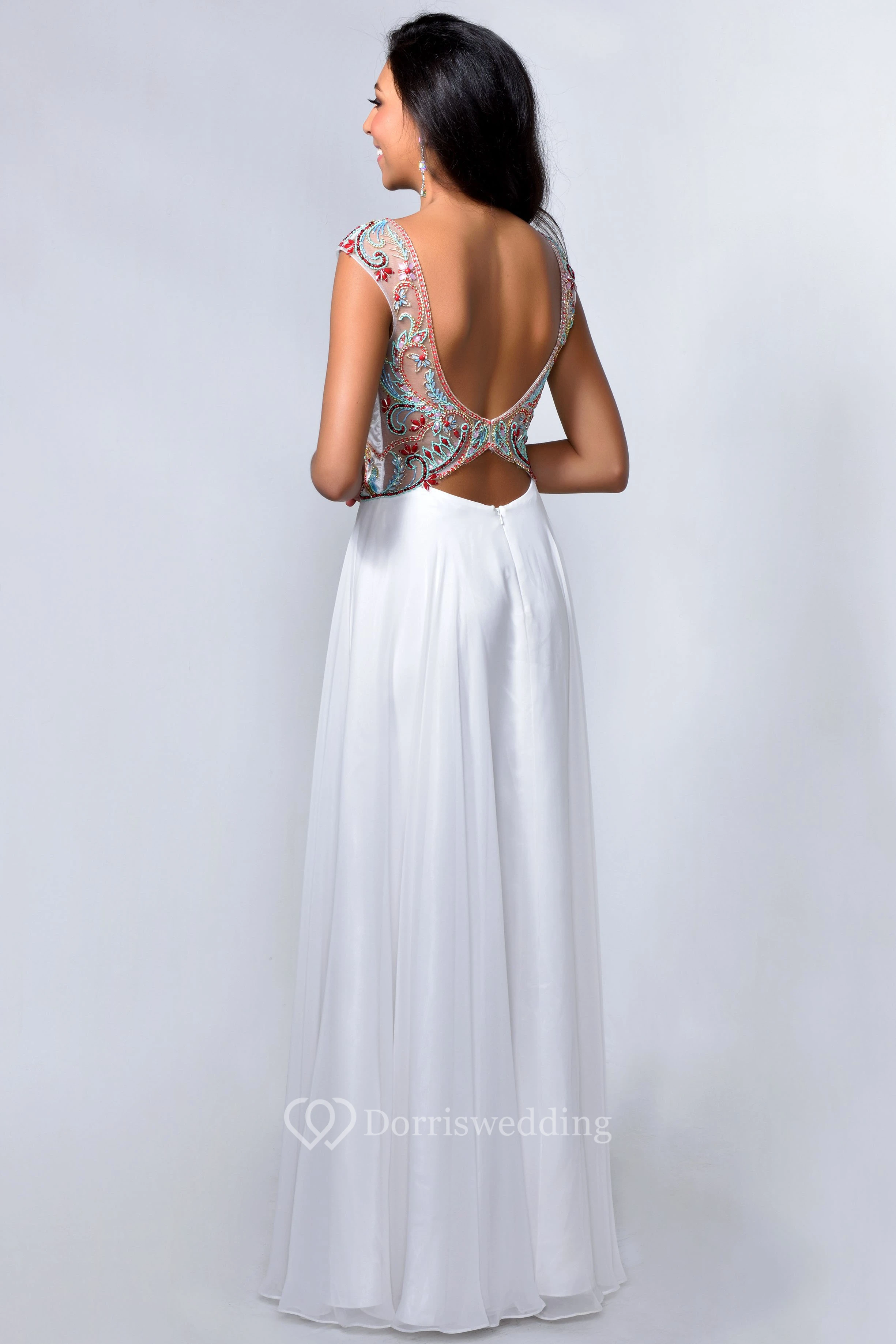 A-Line Long V-Neck Cap-Sleeve Jersey Low-V Back Dress With Appliques