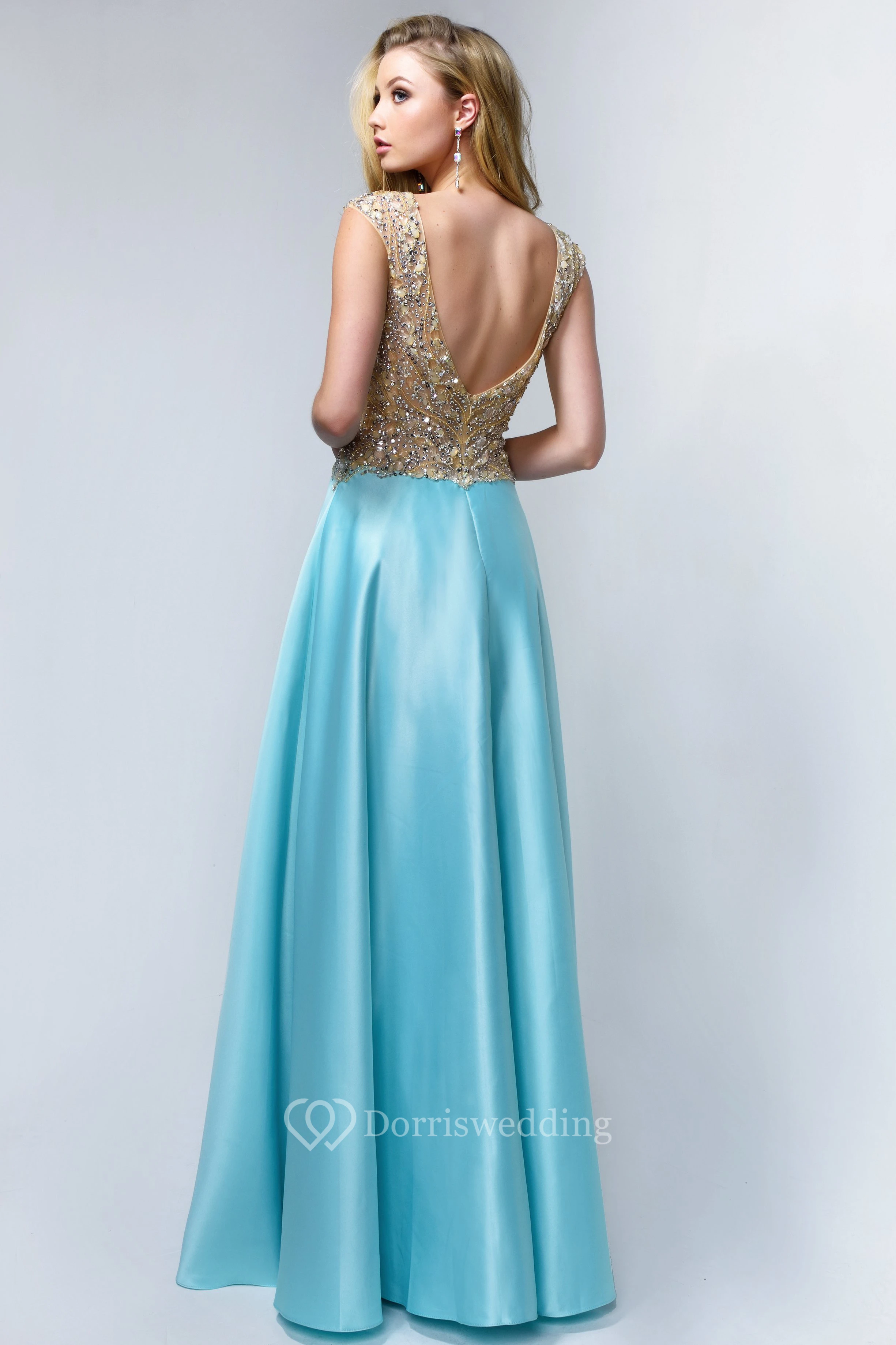 A-Line Long V-Neck Cap-Sleeve Satin Low-V Back Dress With Beading