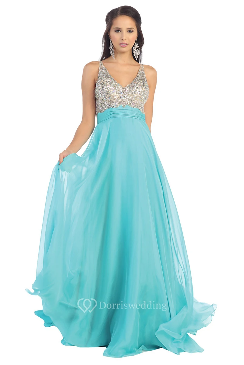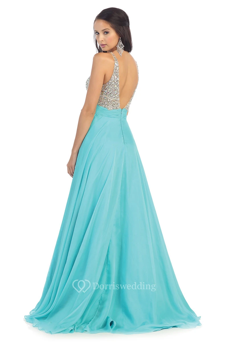 A-Line Long V-Neck Sleeveless Chiffon Deep-V Back Dress With Beading And Pleats